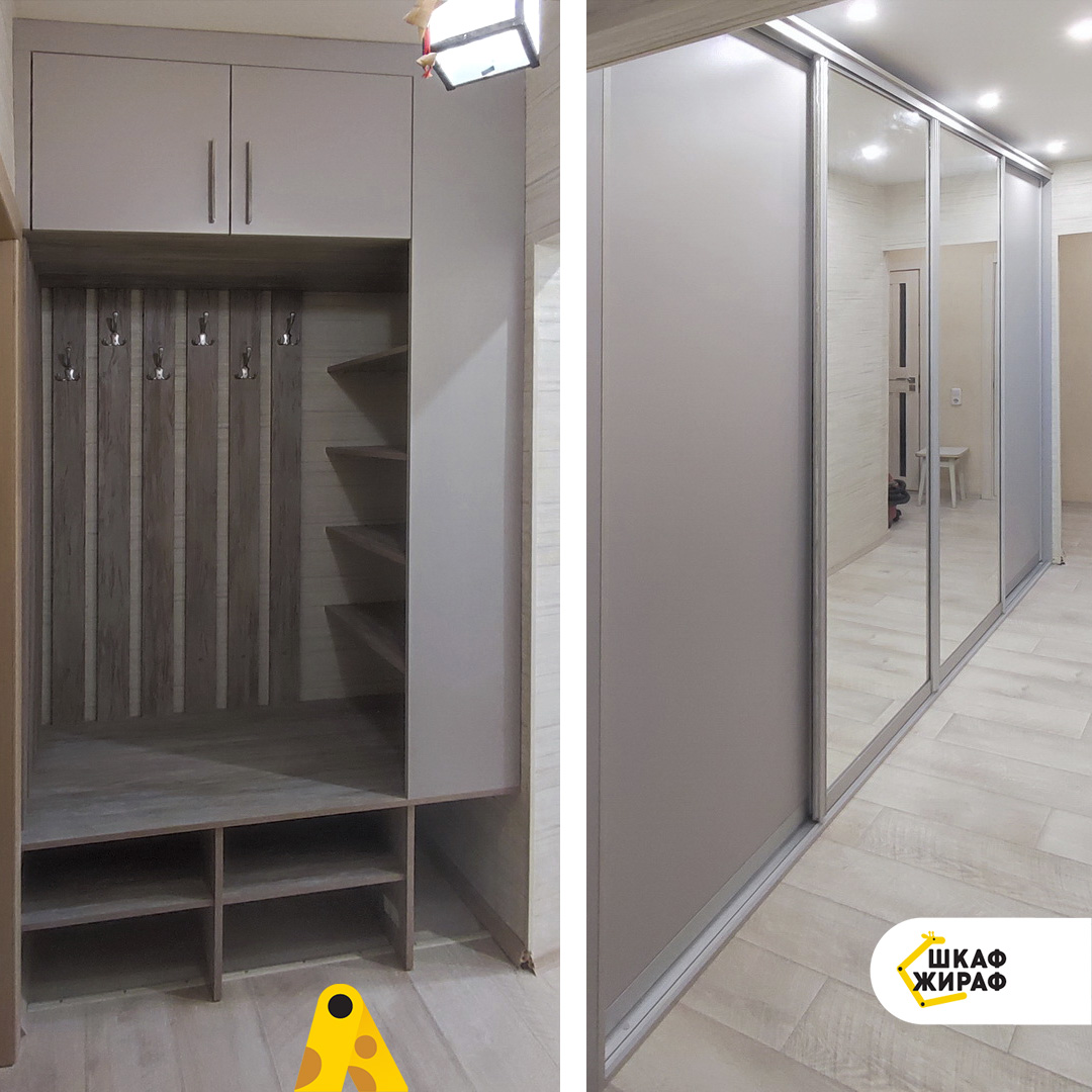 Встроенная прихожая из ДСП двух цветов и широкий вместительный шкаф-купе с дверьми из ДСП и зеркала в серебряном профиле Modus.