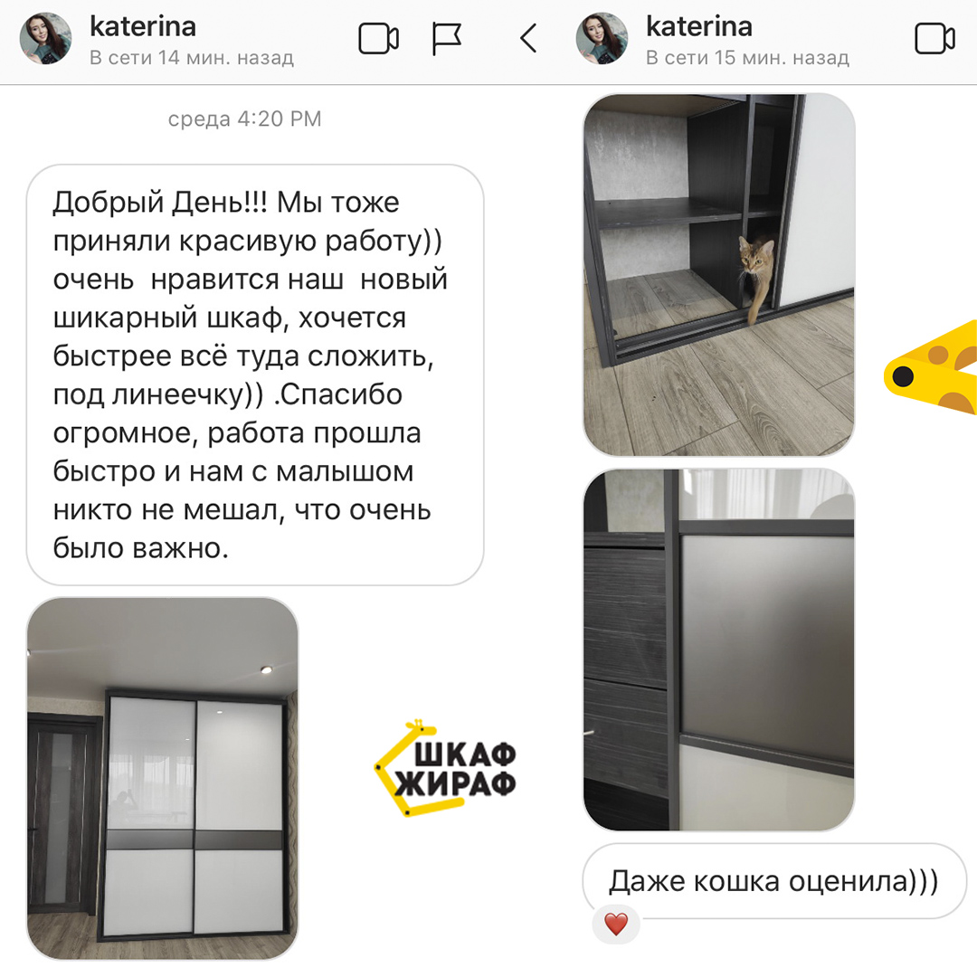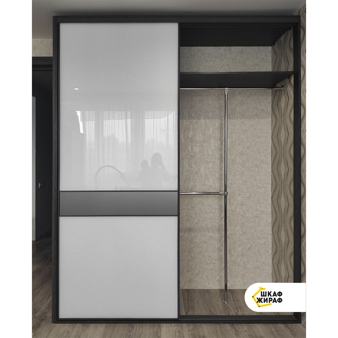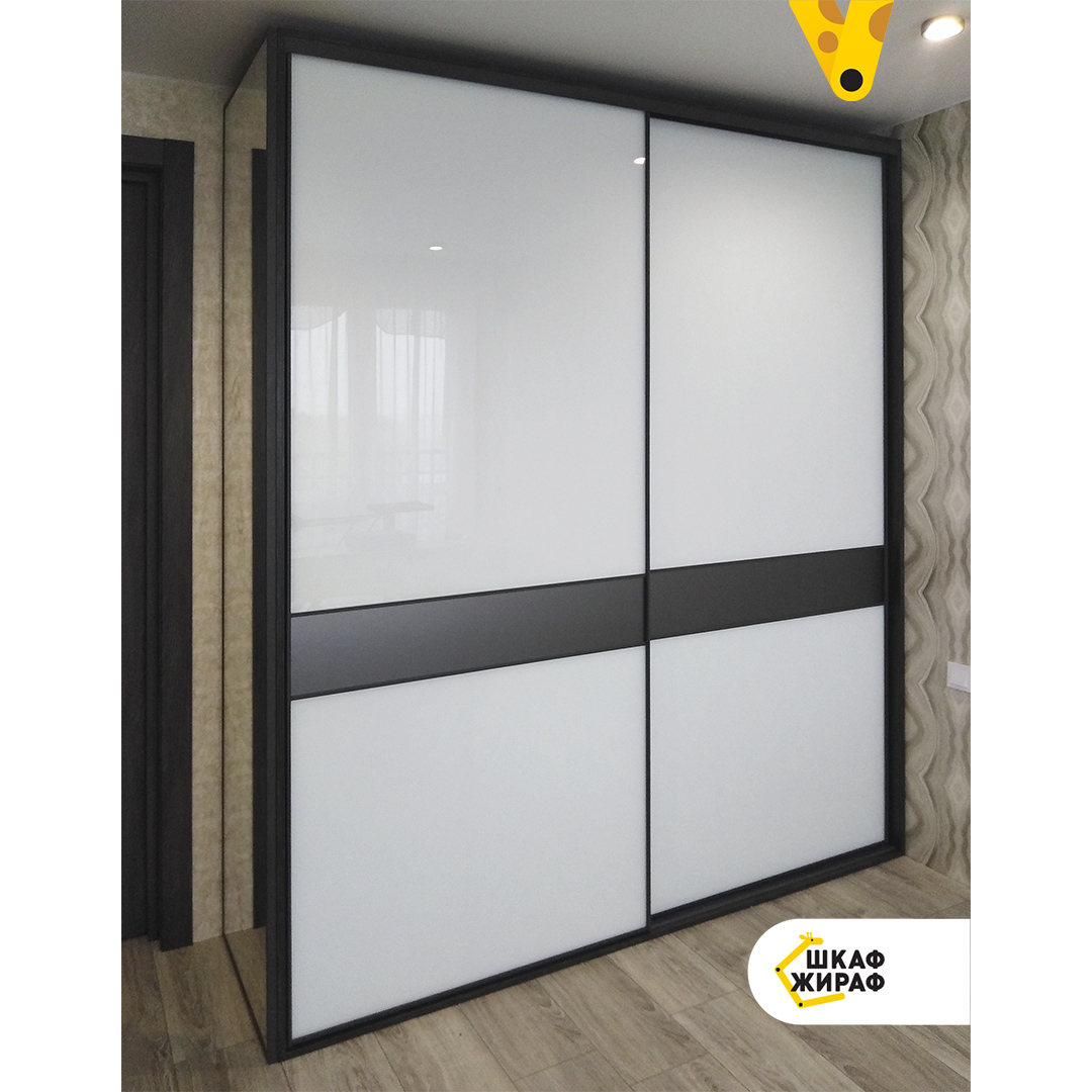 Полувстроенный шкаф-купе с раздвижными дверьми из ультрабелого лакобеля со вставками графитового мателака в узком профиле Modus. На боковой стенке шкафа зеркало в алюминиевом z-профиле. Кошка Аби проверила качество сборки шкафа и разрешила своей хозяйке Катерине написать позитивный отзыв о нашей работе, за что им огромное спасибо!