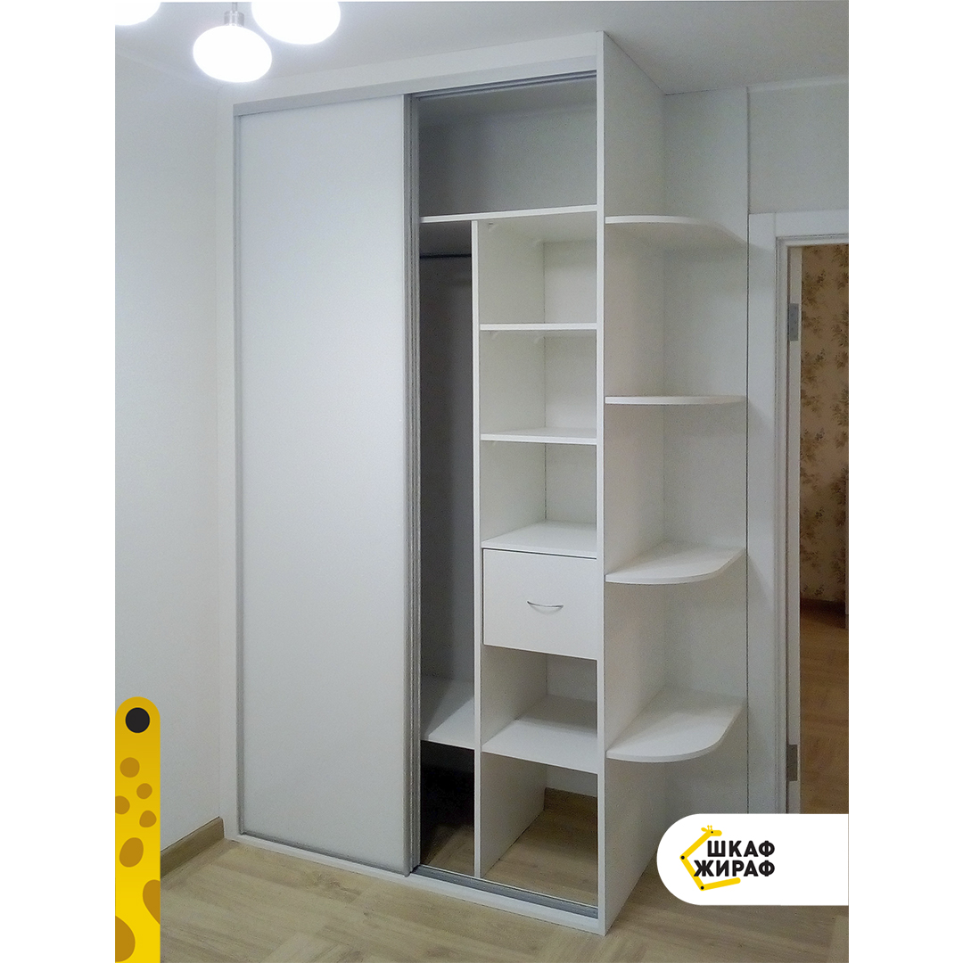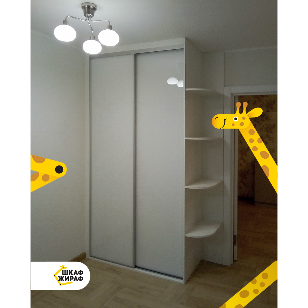 Шкаф-купе с открытыми радиусными полками и дверьми из белого лакобеля в узком профиле Modus.