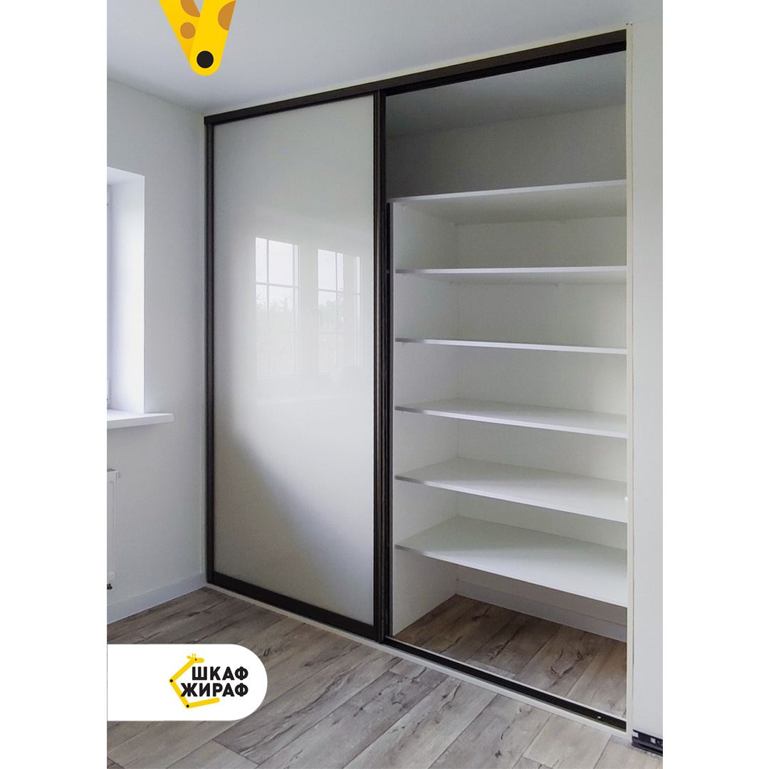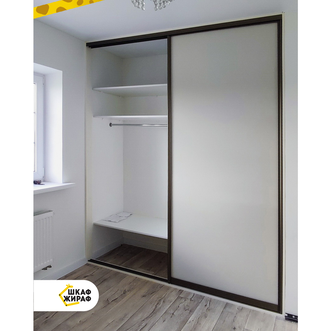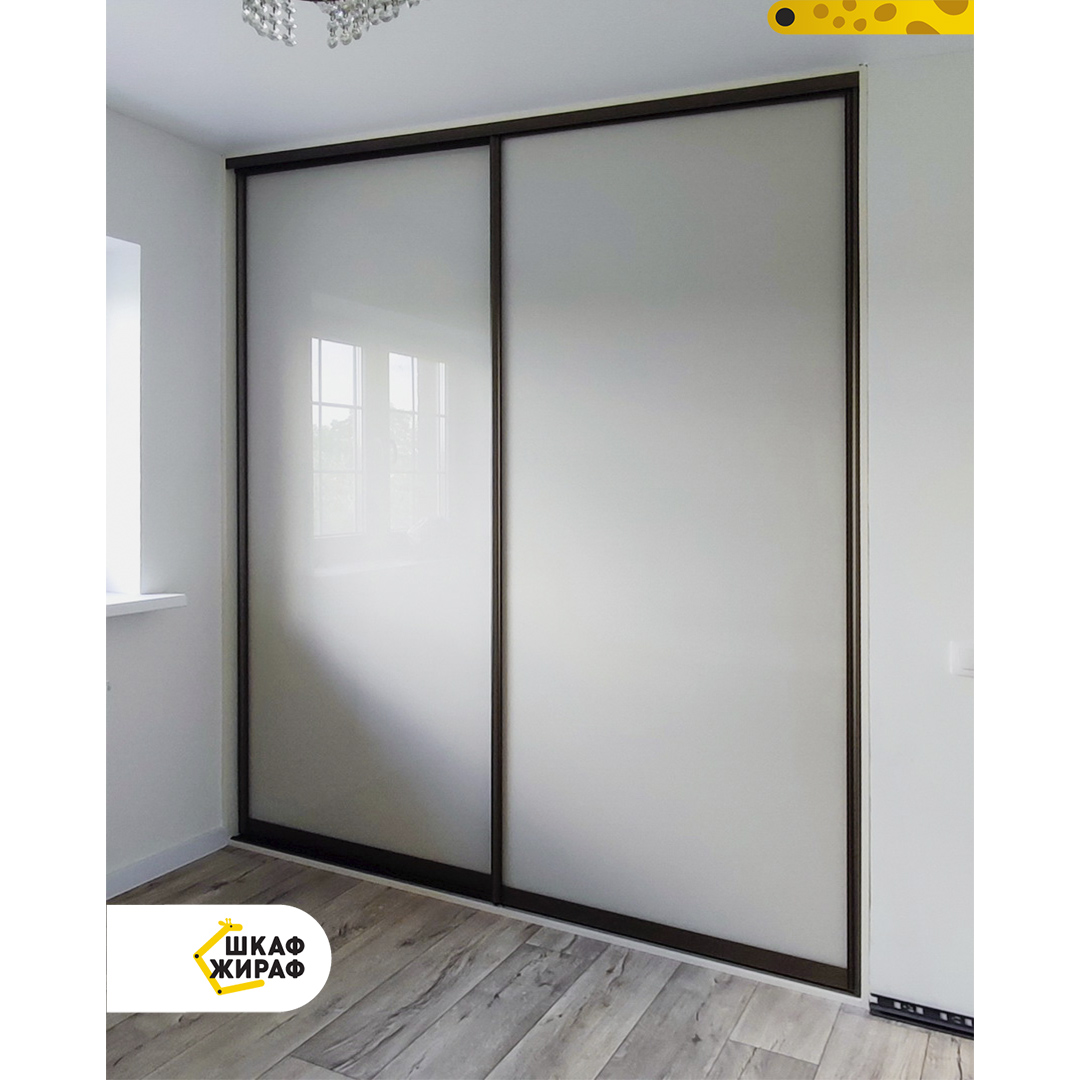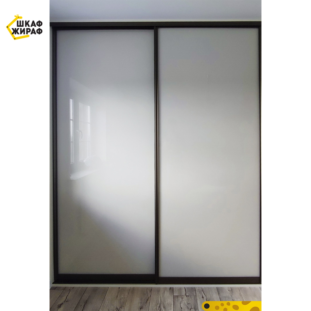 Широкий вместительный двухдверный шкаф-купе с дверьми из жемчужно-белого лакобеля в профиле Modus цвета шампань.
