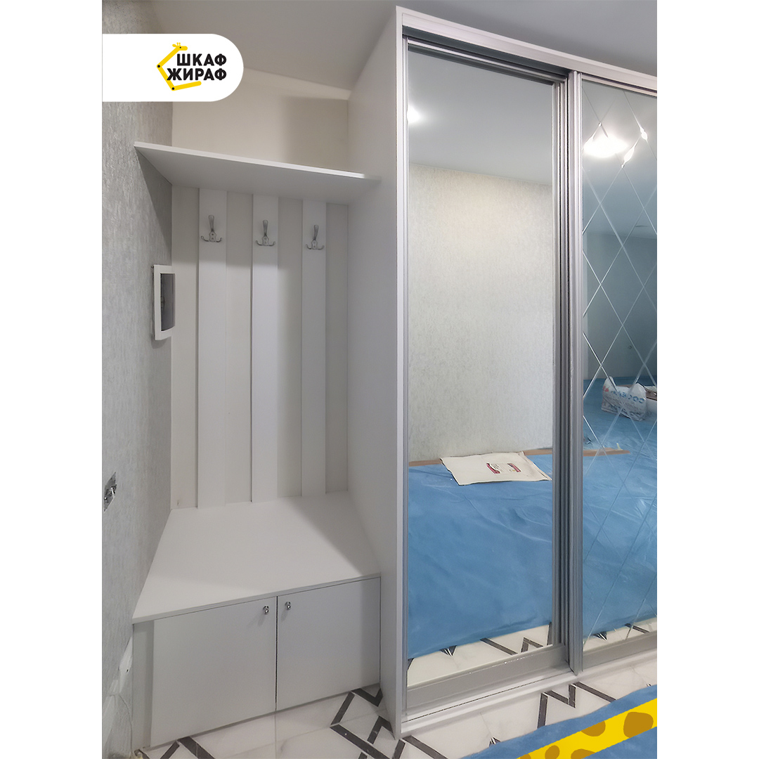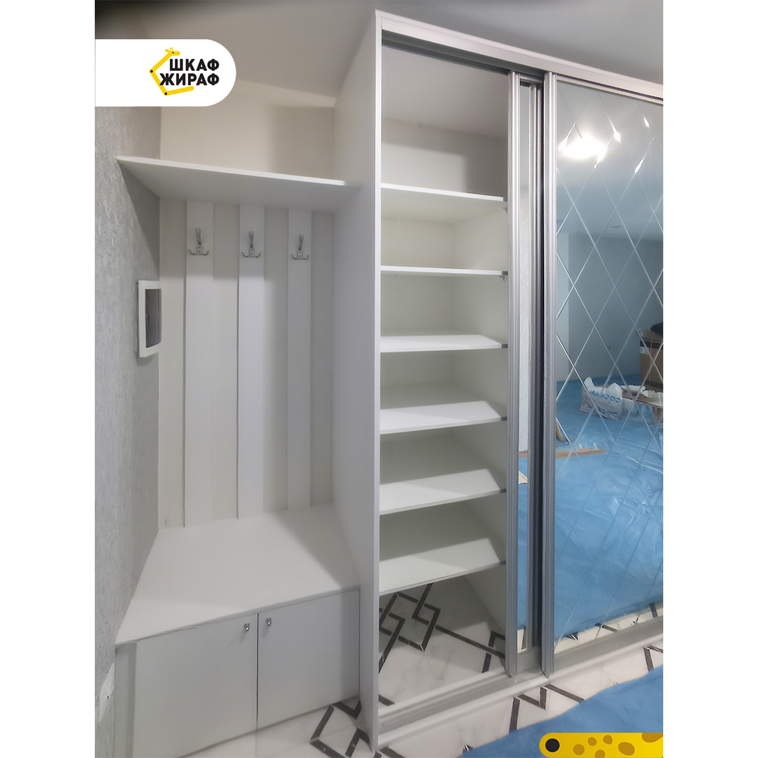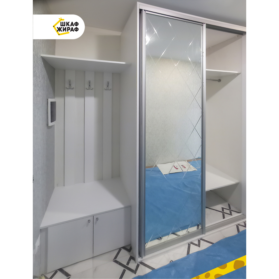 Белоснежный шкаф-купе с открытой прихожей. Фасад из зеркала и зеркала с алмазной гравировкой в серебряном профиле Modus.