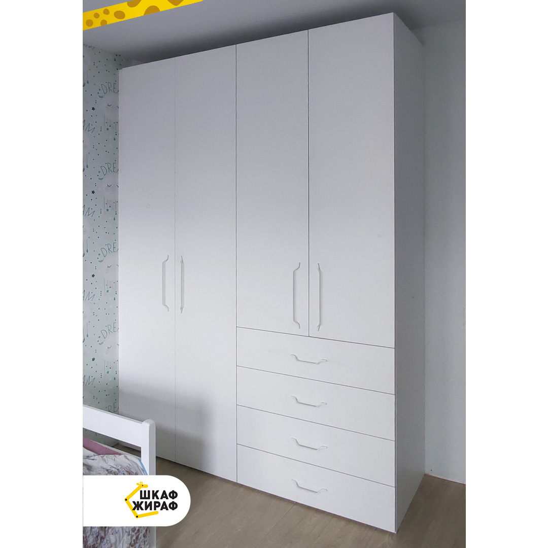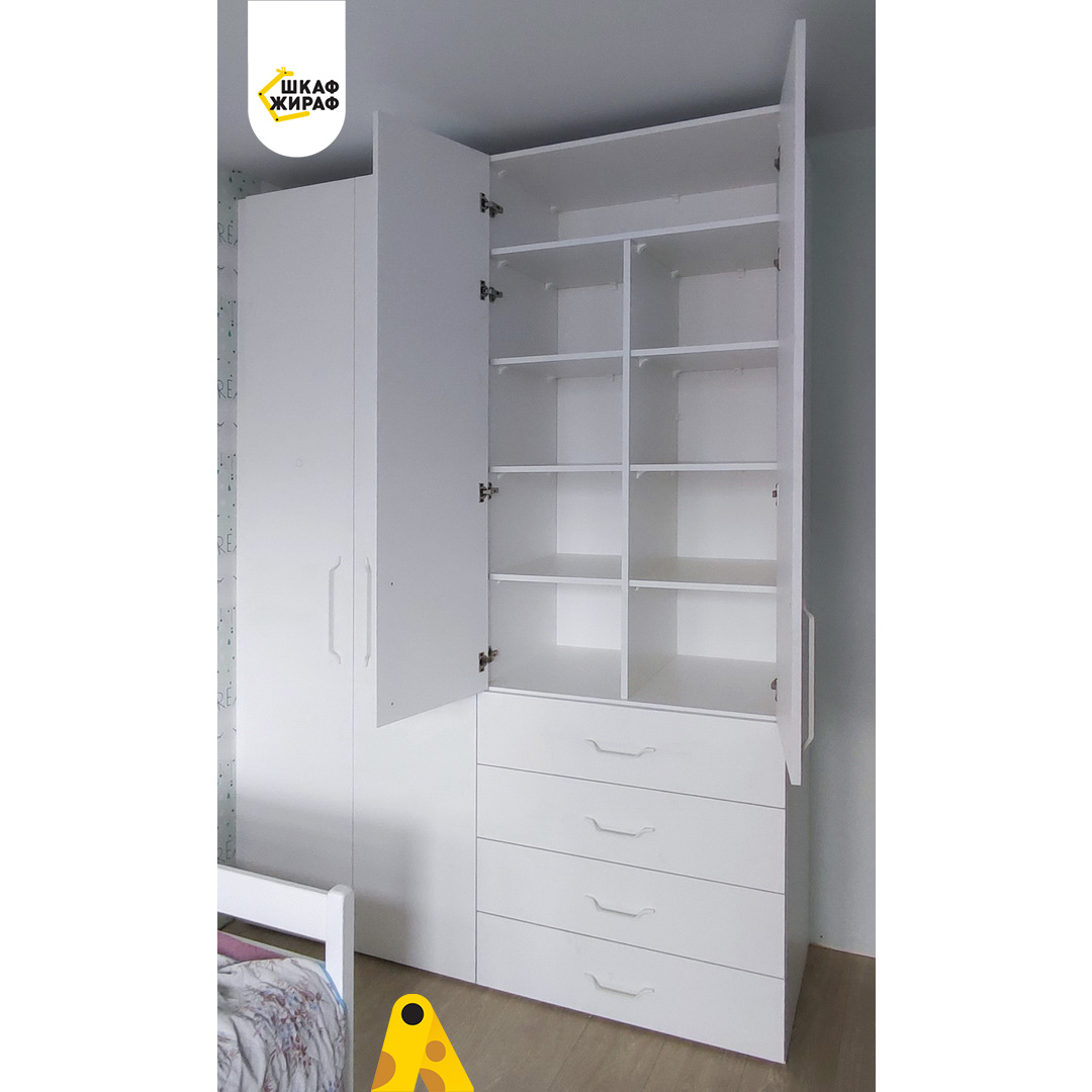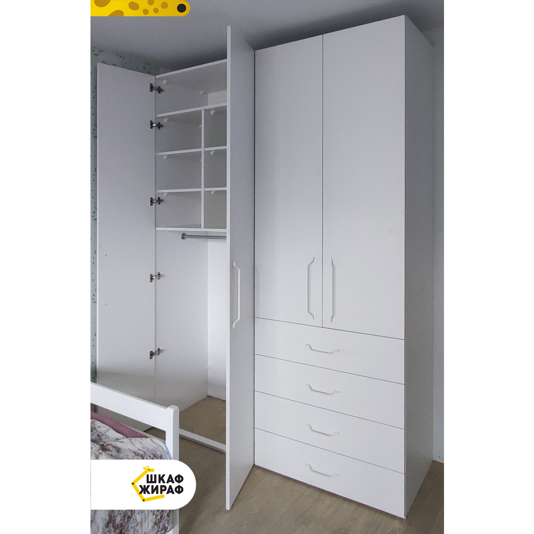 Распашной шкаф со встроенным комодом и оригинальными ручками на фасадах из белоснежной ДСП.