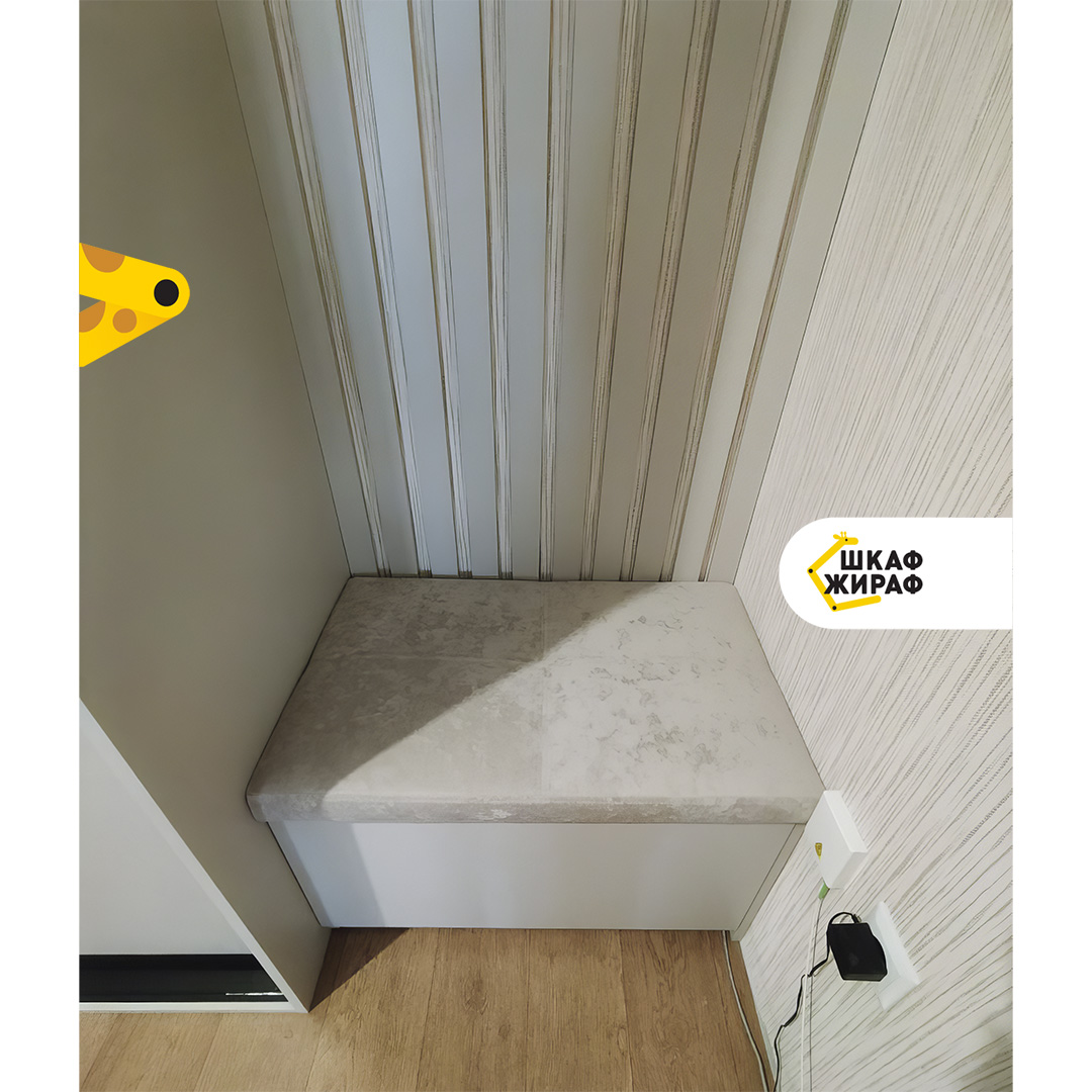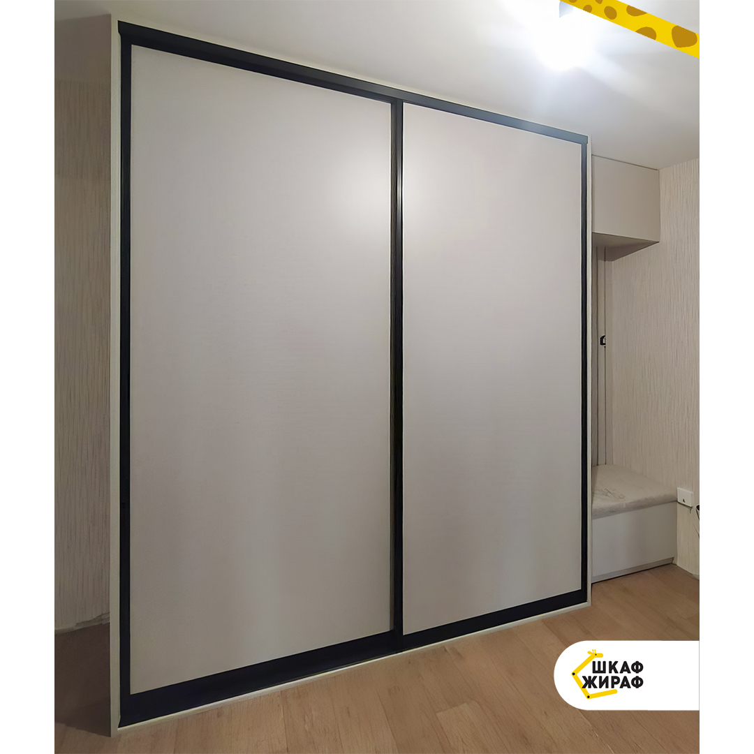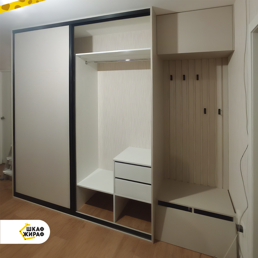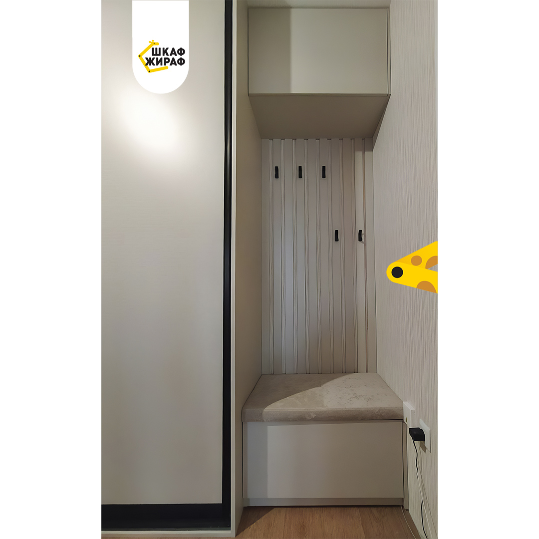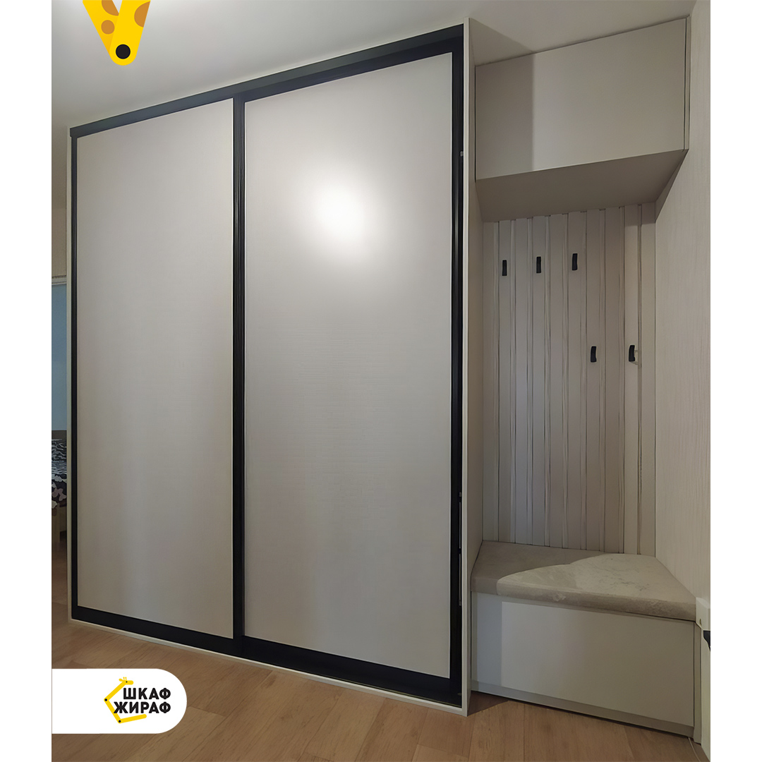 Двухдверный шкаф-купе в комплексе с прихожей: мягкой тумбой для обуви, антресольной полкой и планками с крючками для верхней одежды