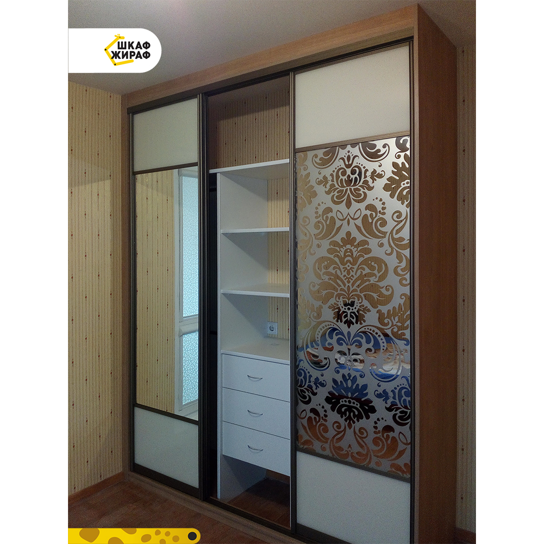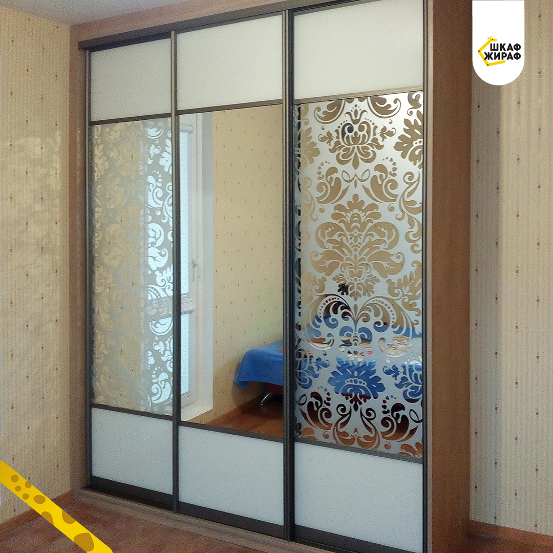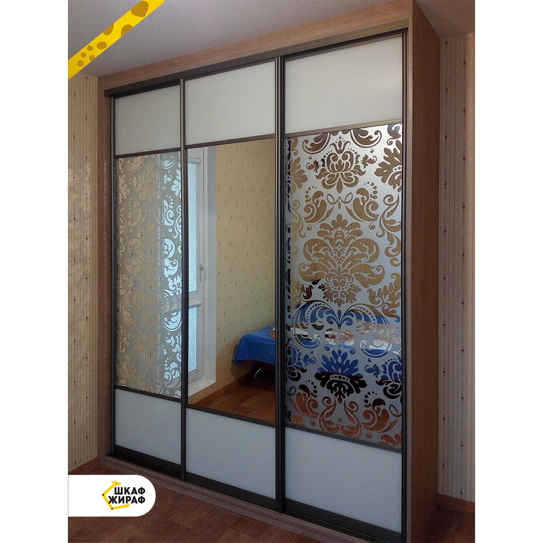 Трехдверный шкаф-купе в спальню с раздвижными дверьми из зеркала, лакобеля и зеркала с пескоструйным рисунком.
