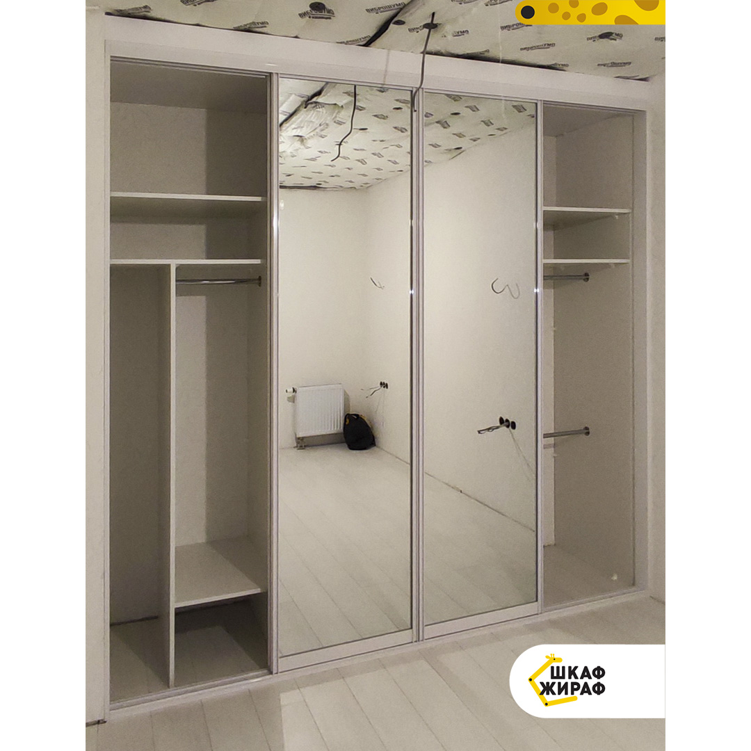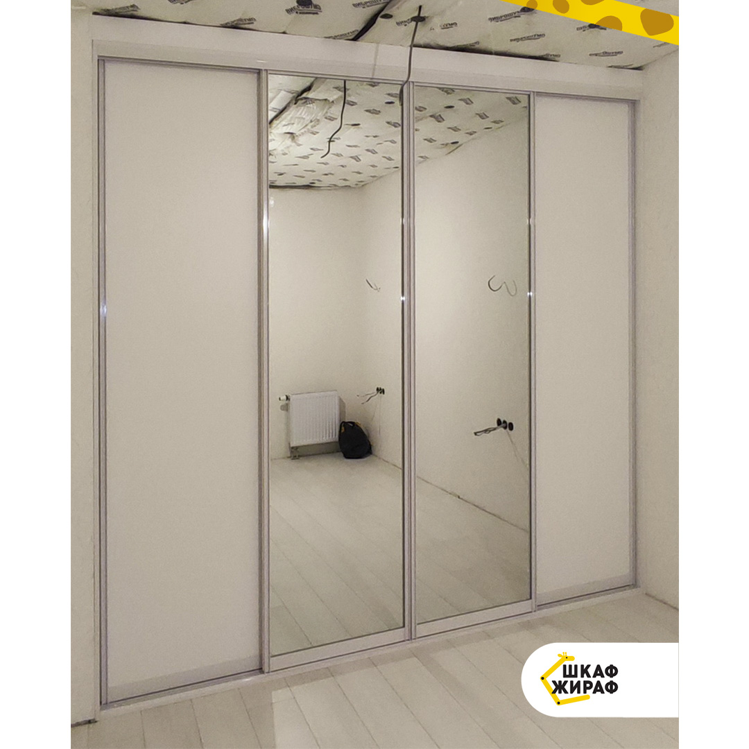 Вместительный четырехдверный шкаф-купе с двумя зеркальными и двумя ДСП дверьми в белом профиле Modus.