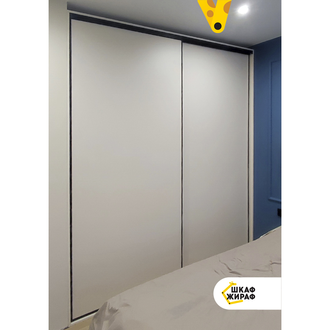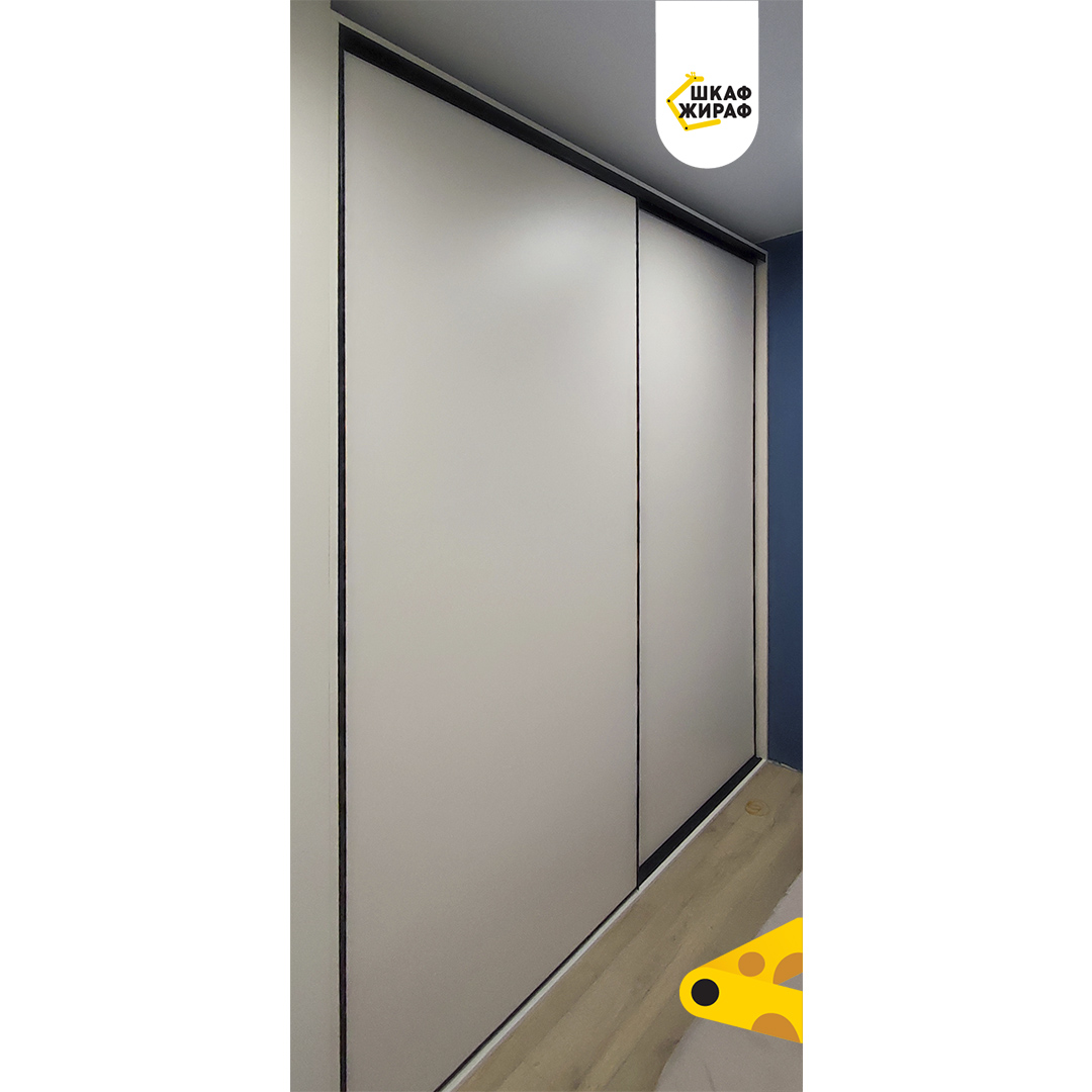 Широкий двухдверный шкаф-купе с фасадами из ДСП бежевого цвета в узком черном профиле Modus.