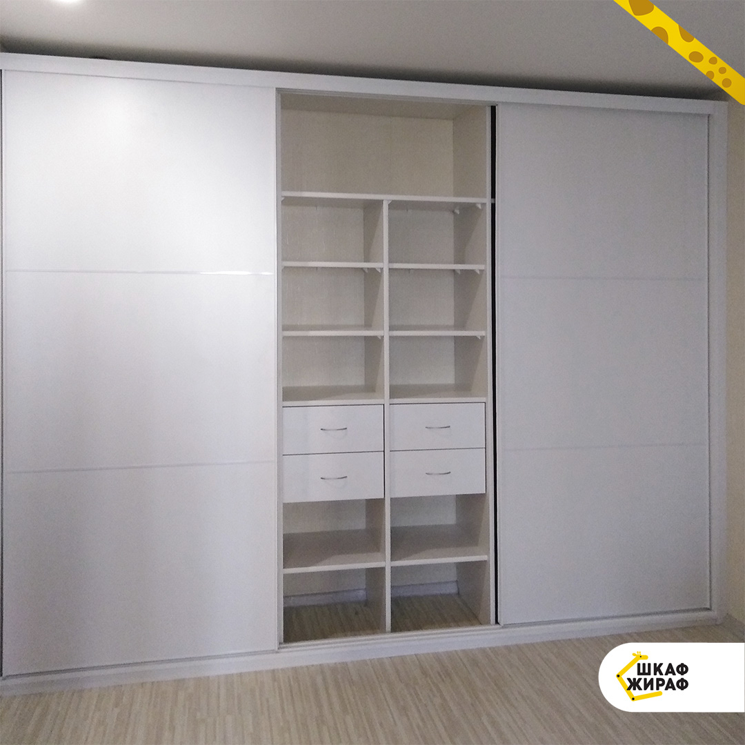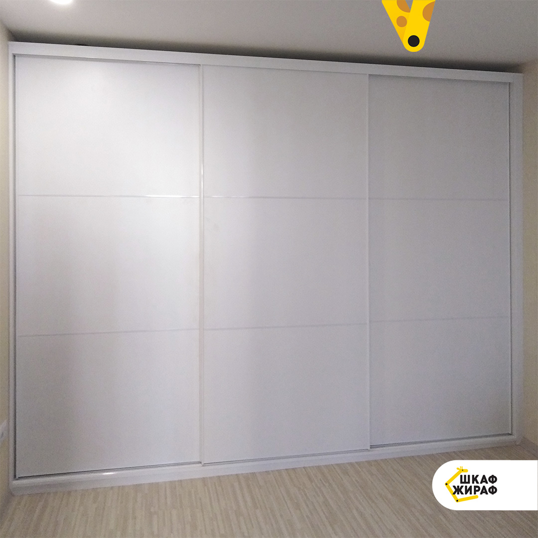 Шкаф-купе с фасадом в стиле «минимализм» из белых панелей лДСП в узком белом профиле Modus с разделениями.