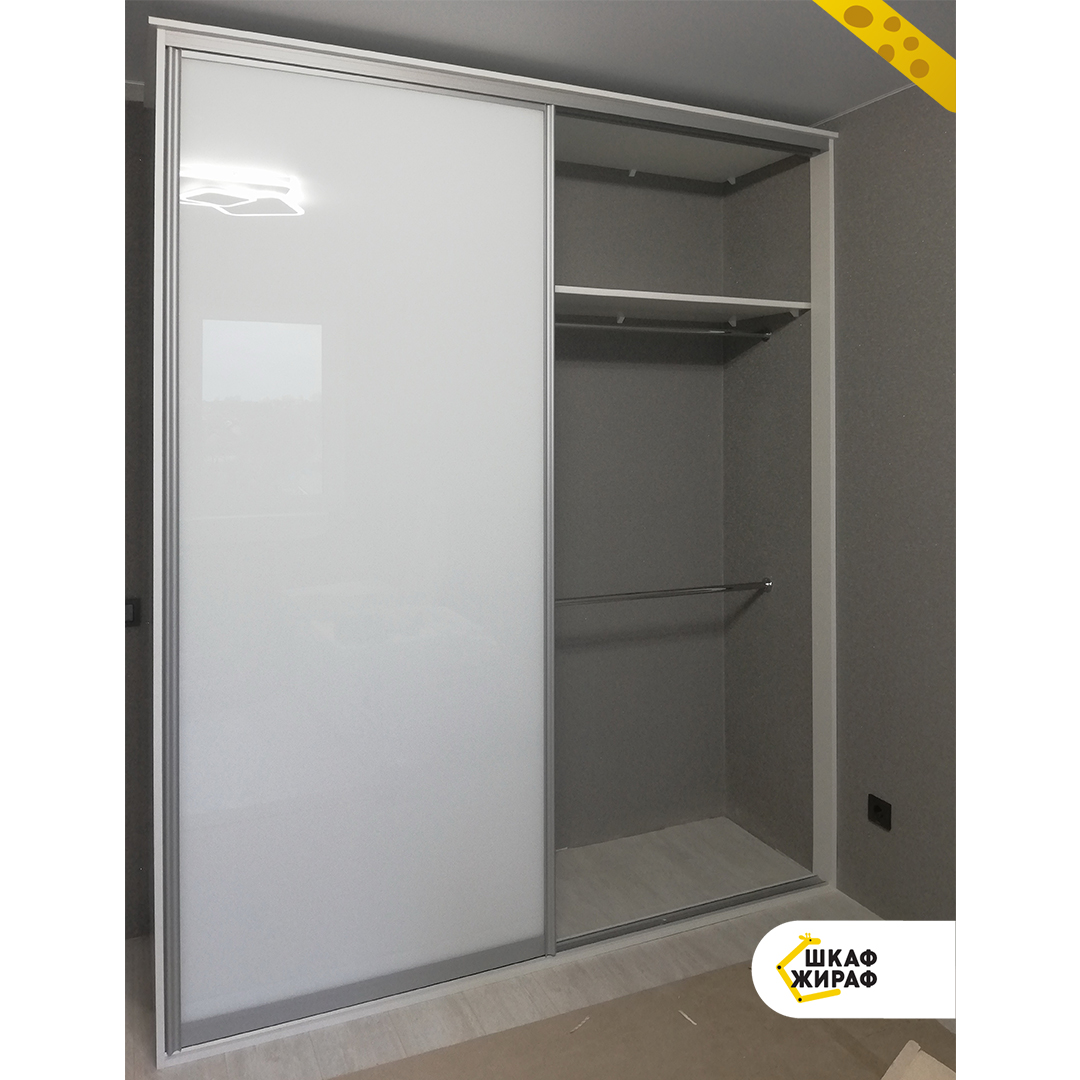 Двухметровый полувстроенный шкаф с дверьми из белого лакобеля в серебряном закрытом профиле Modus.