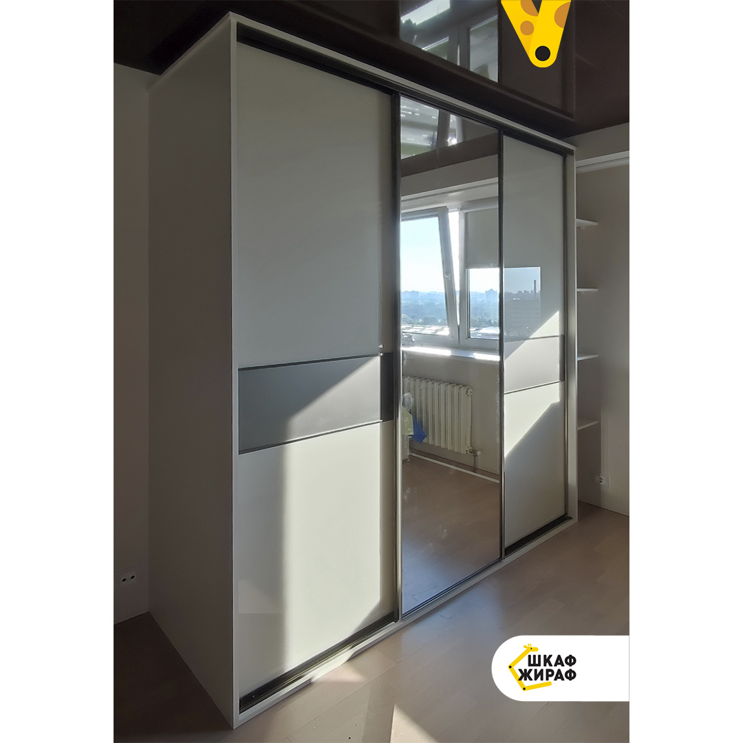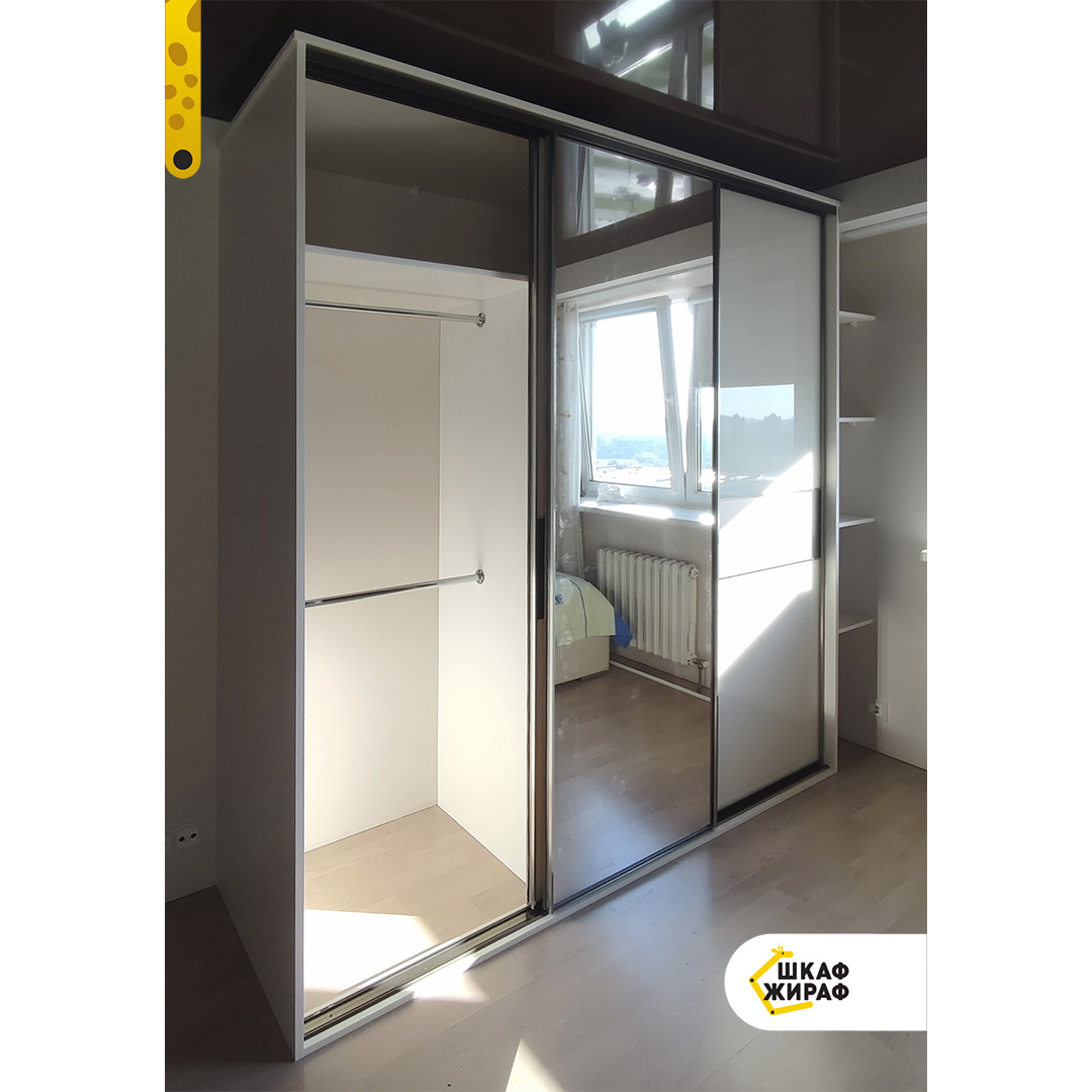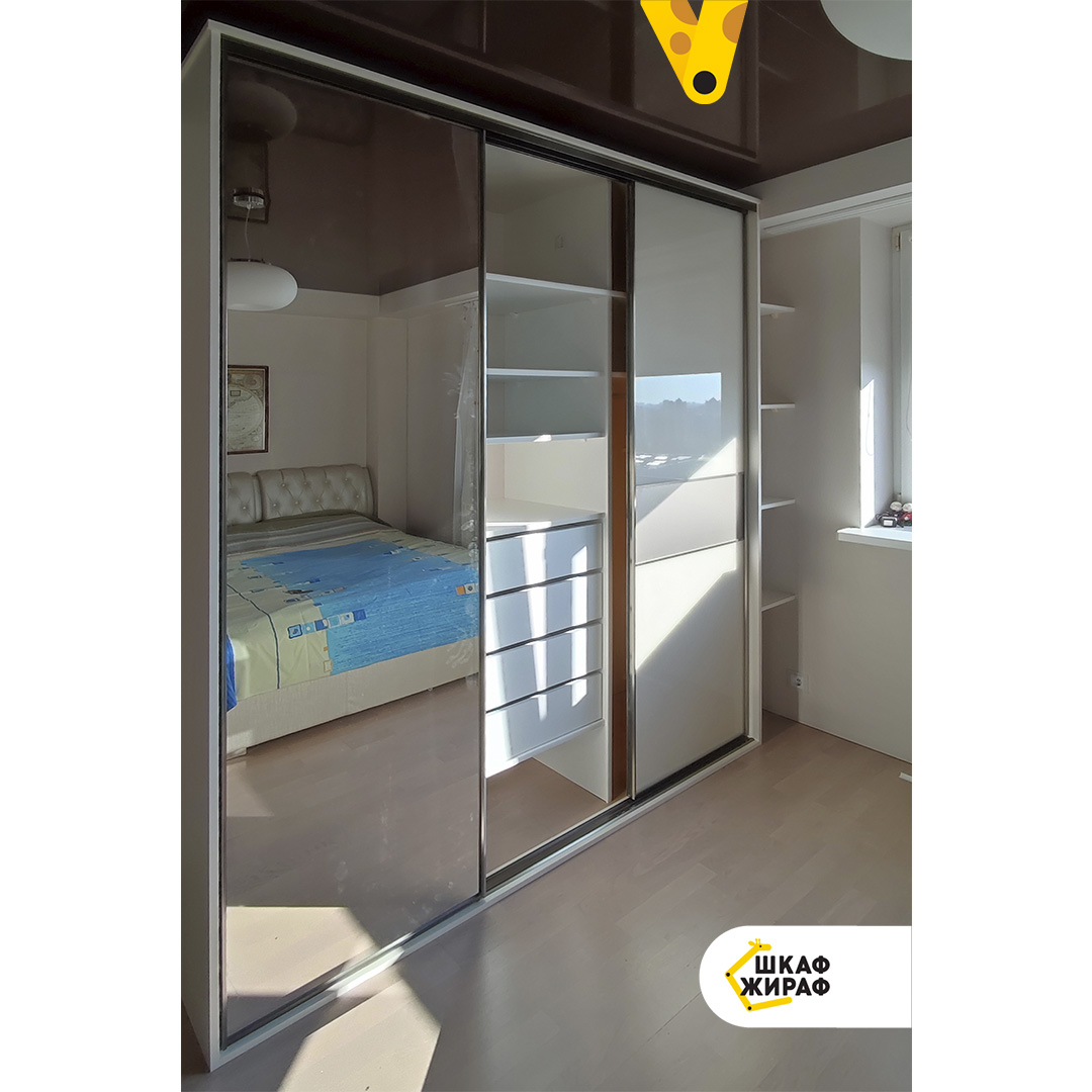 Трехдверный полувстроенный шкаф-купе с дверьми из зеркала и жемчужного лакобеля со вставками бронзового мателака в узком профиле Modus.