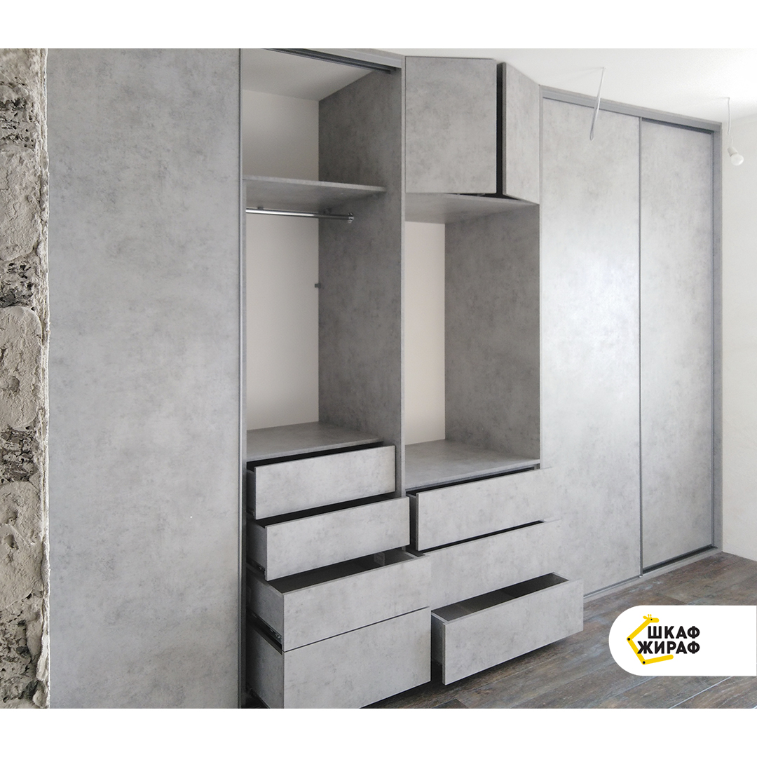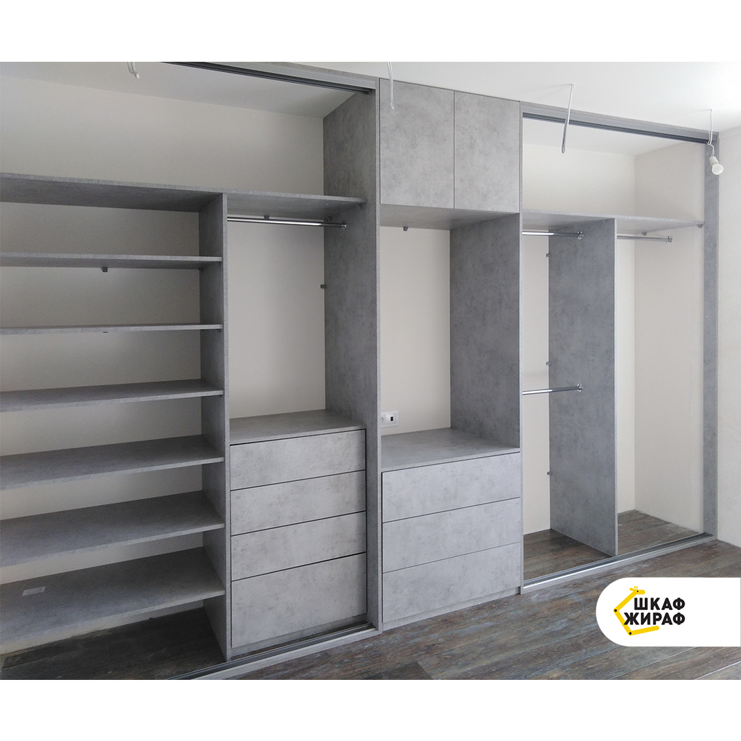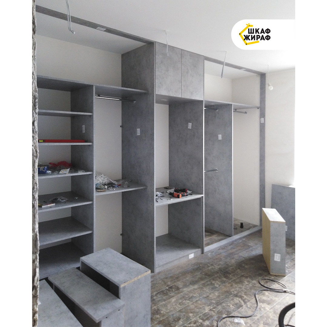 В галерее пример по-настоящему необычного шкафа — комплекса из двух шкафов-купе и нишей под телевизор из лДСП имитирующей Бетон.