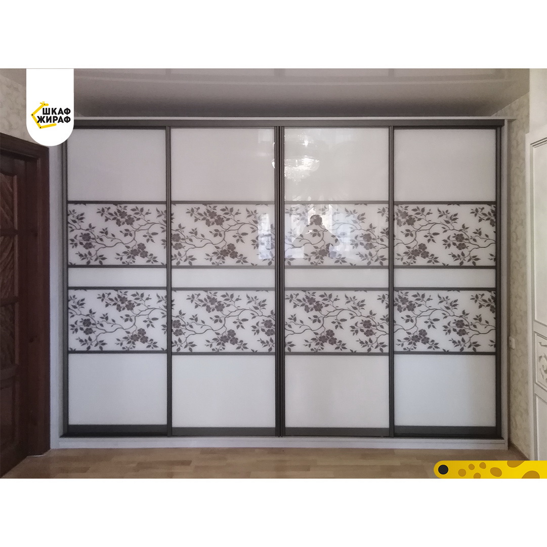 Четырехдверный встроенный шкаф-купе с крышей и комбинированным фасадом со вставками из белого лакобеля и крашеного лакобеля с рисунком.