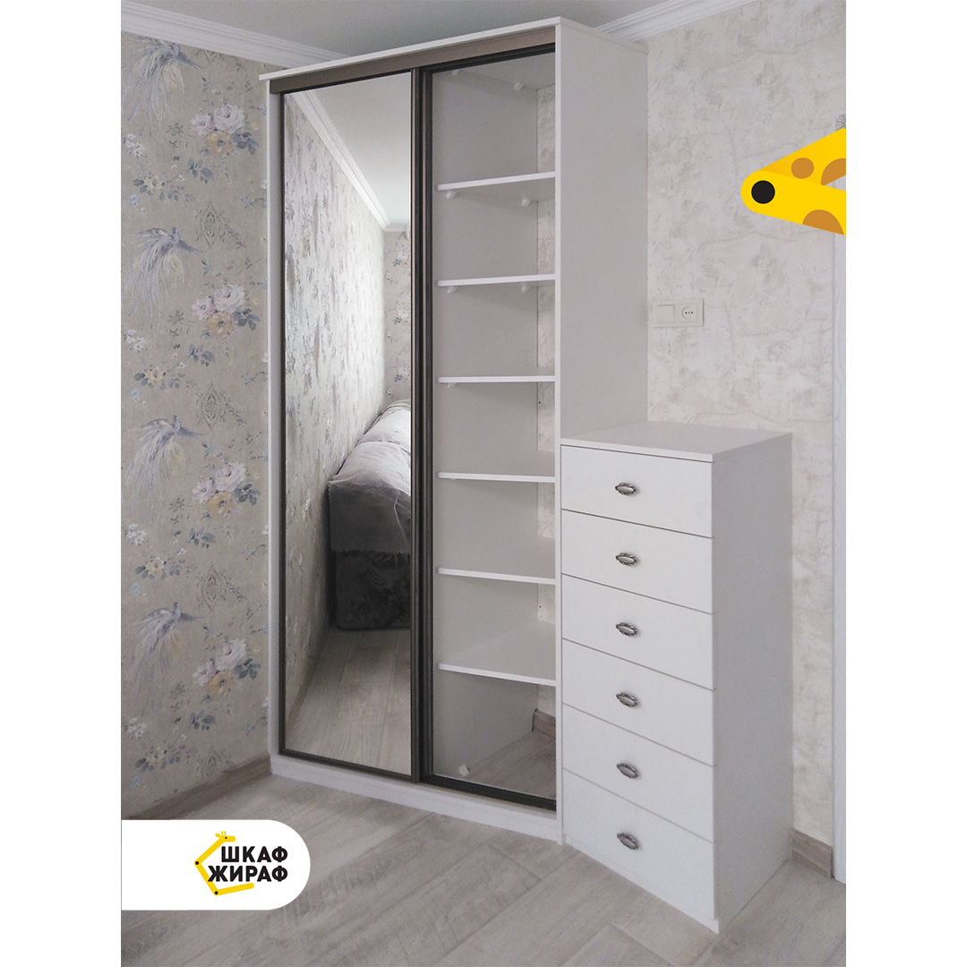 Белый скошенный шкаф-купе с комодом.