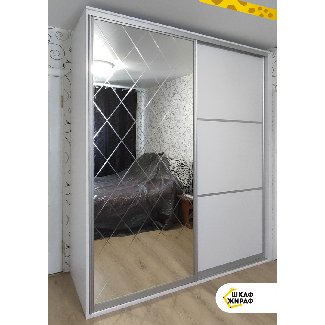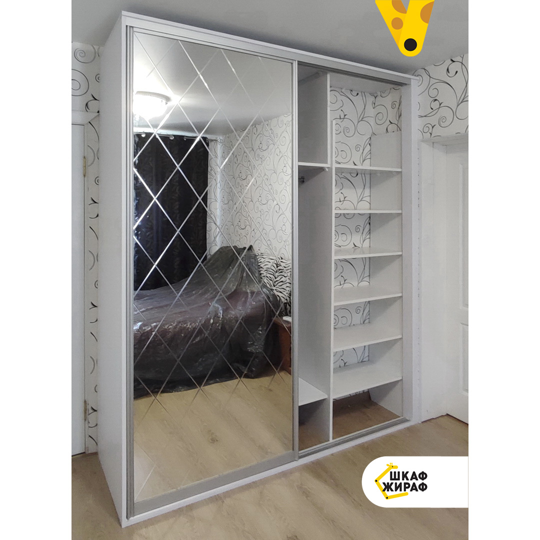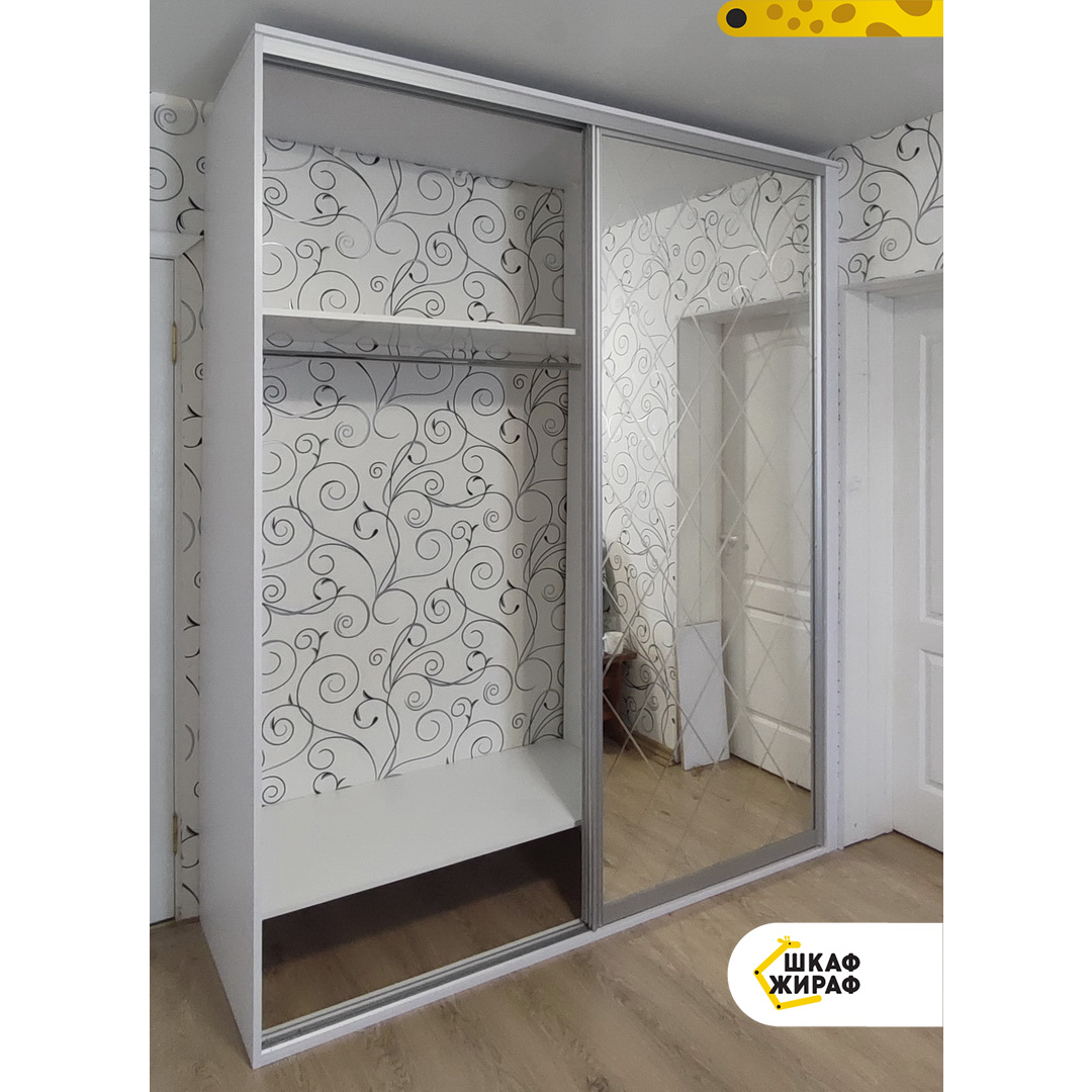 Двухдверный полувстроенный шкаф-купе с дверьми из белой бриллиантовой ДСП с разделениями и зеркала с алмазной гравировкой в серебряном профиле Modus.