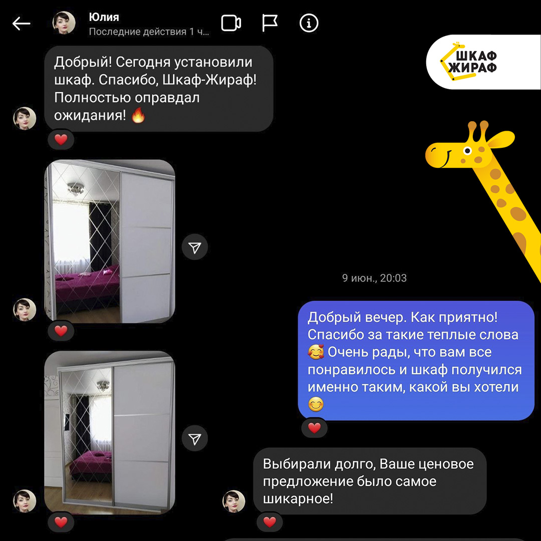 Платяной отсек слева пристроили к отсеку с полками, который уже был запланирован для нового шкафа. Наша Клиентка Юлия осталась довольна результатом, о чем и написала в отзыве, за что ей большое-пребольшое спасибо.