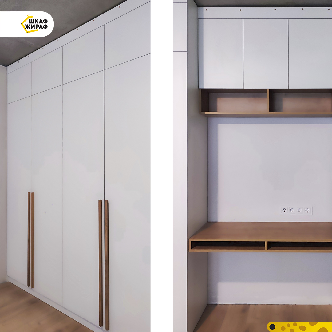 Комплекс из распашного шкафа, стола и подвесной антресоли над ним.