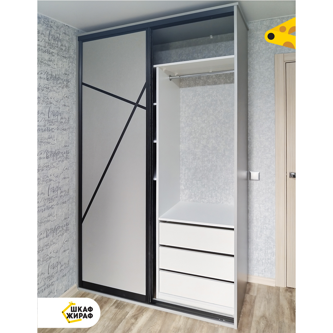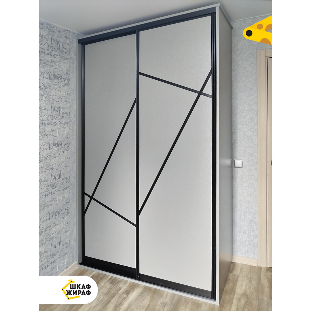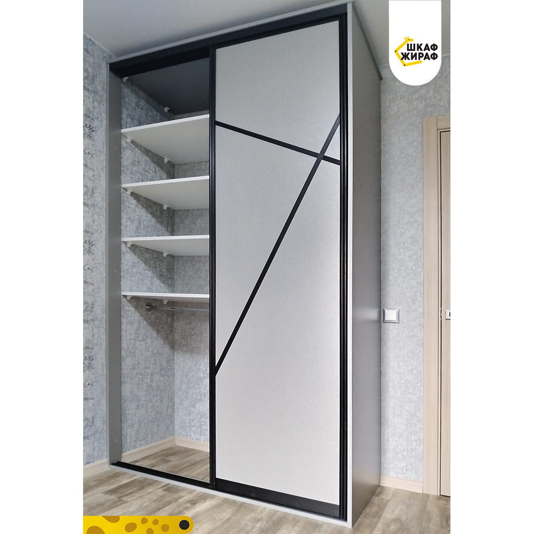 Полувстроенный шкаф-купе c дверьми из ДСП Krono цвета Платиновый Диск с диагональными разделениями в черном профиле Modus.