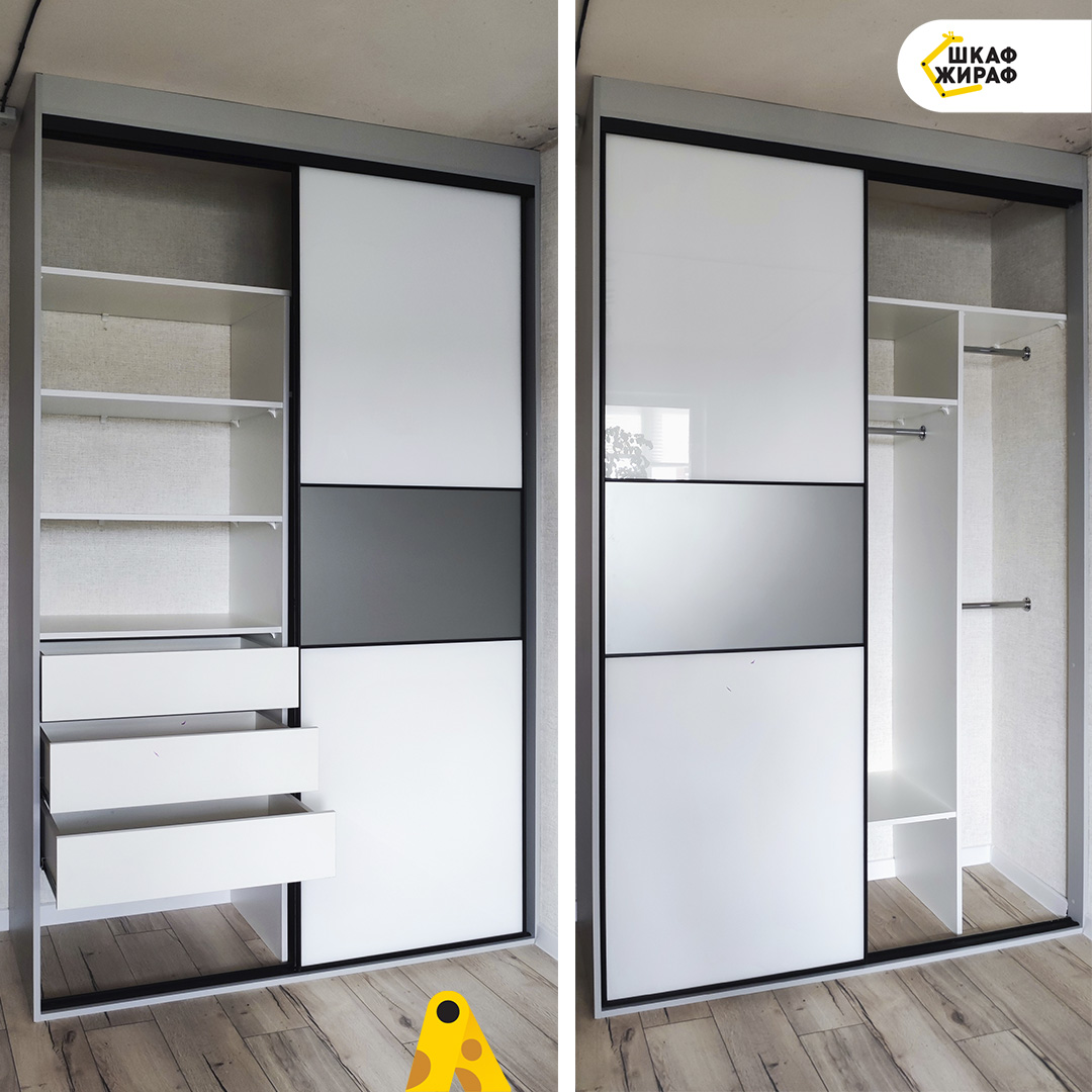 Двухдверный шкаф-купе с дверьми из ультрабелого лакобеля со вставками сатинированного зеркала цвета графит в узком черном профиле Modus.
