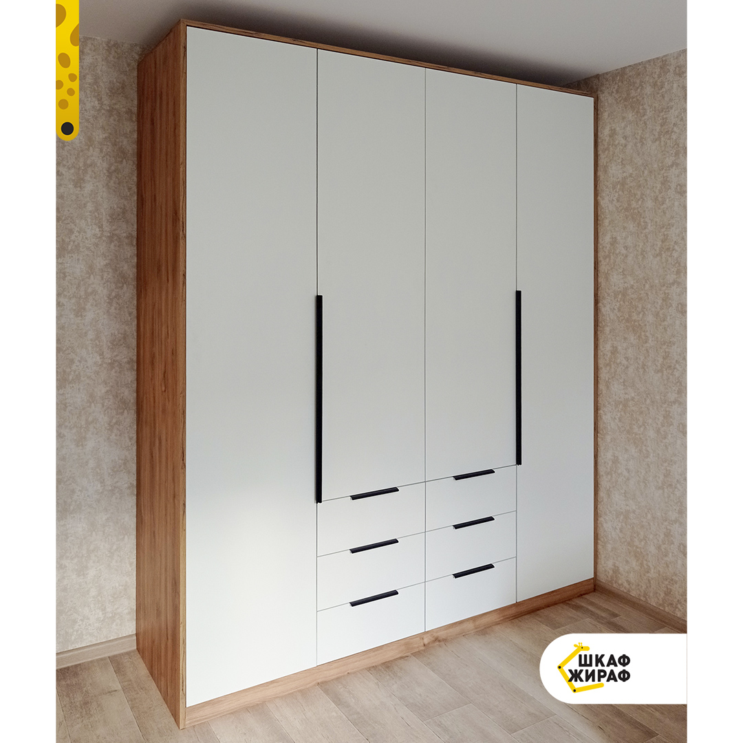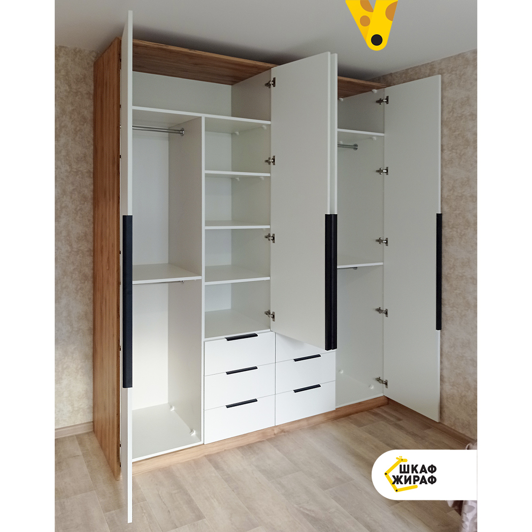 Распашной шкаф с фасадами из белой ДСП Egger и обрамлением из ДСП Krono цвета Дуб Наварра.