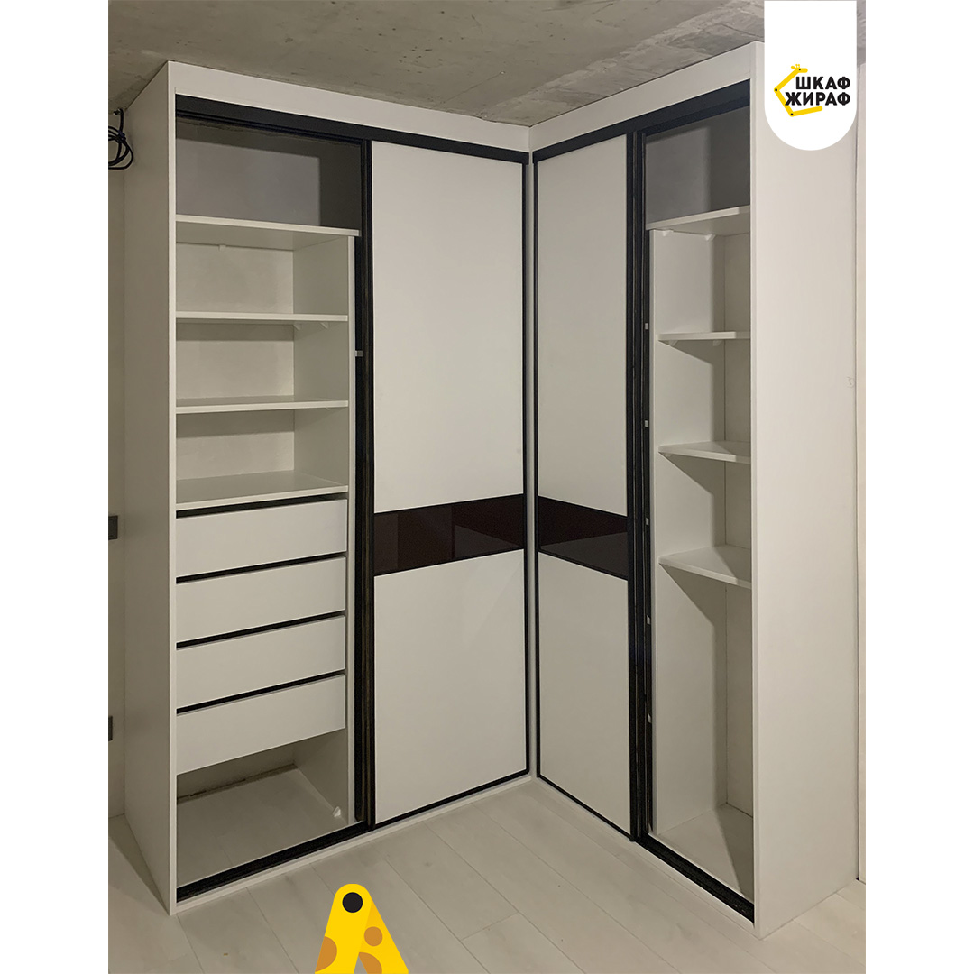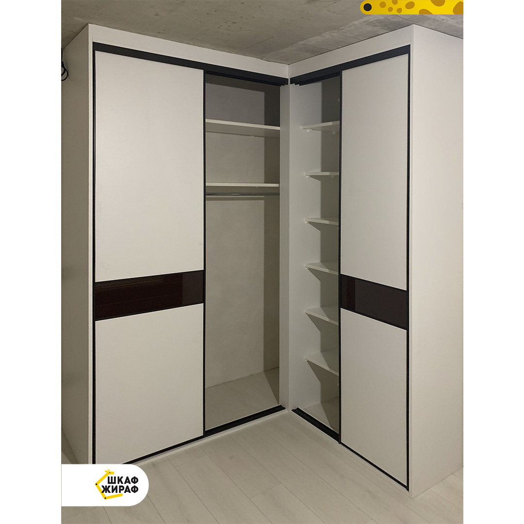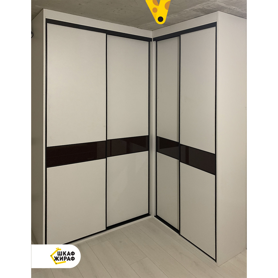 Угловой Г-образный шкаф-купе белого цвета в темном узком профиле Modus со вставками из коричневого лакобеля.