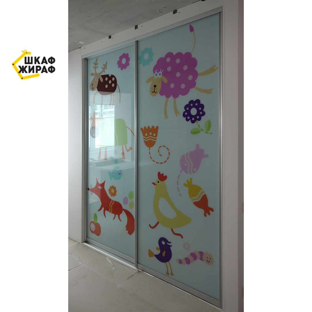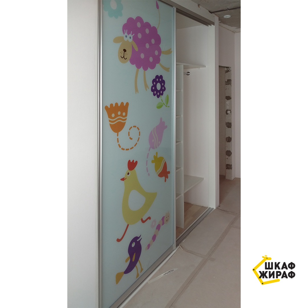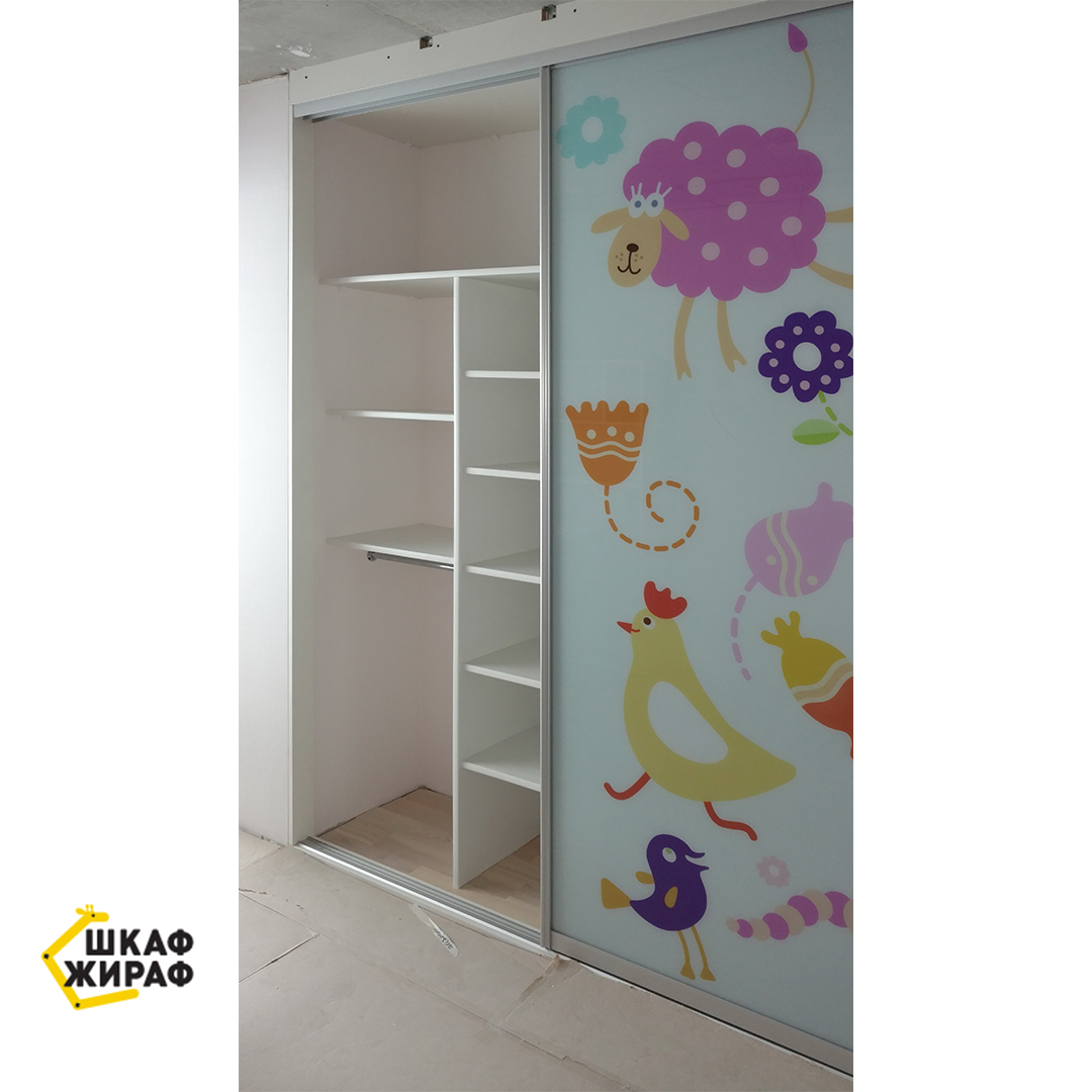Светлый шкаф-купе для детской комнаты. Фотопечать с позитивными мультяшными животными создает ребенку хорошее настроение.