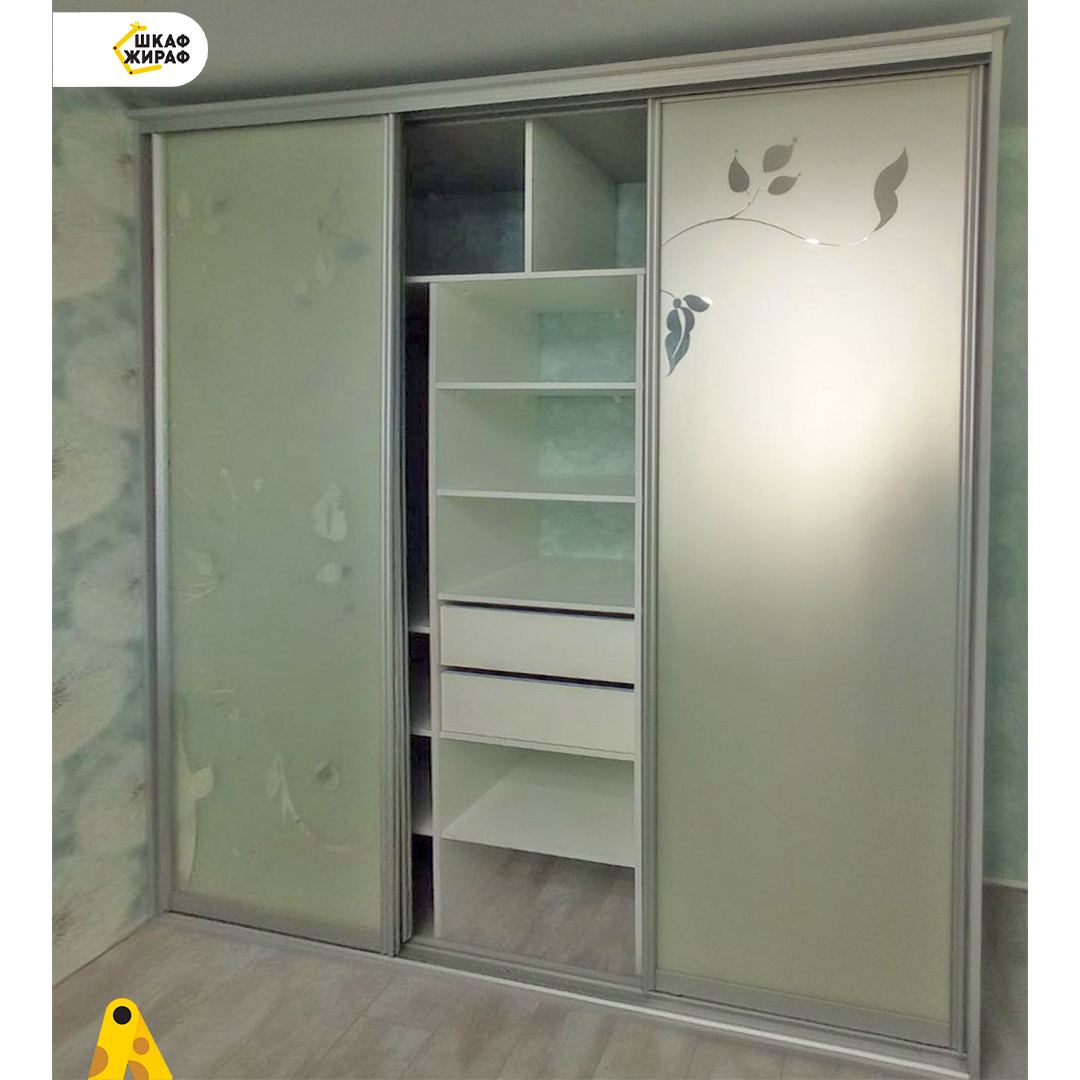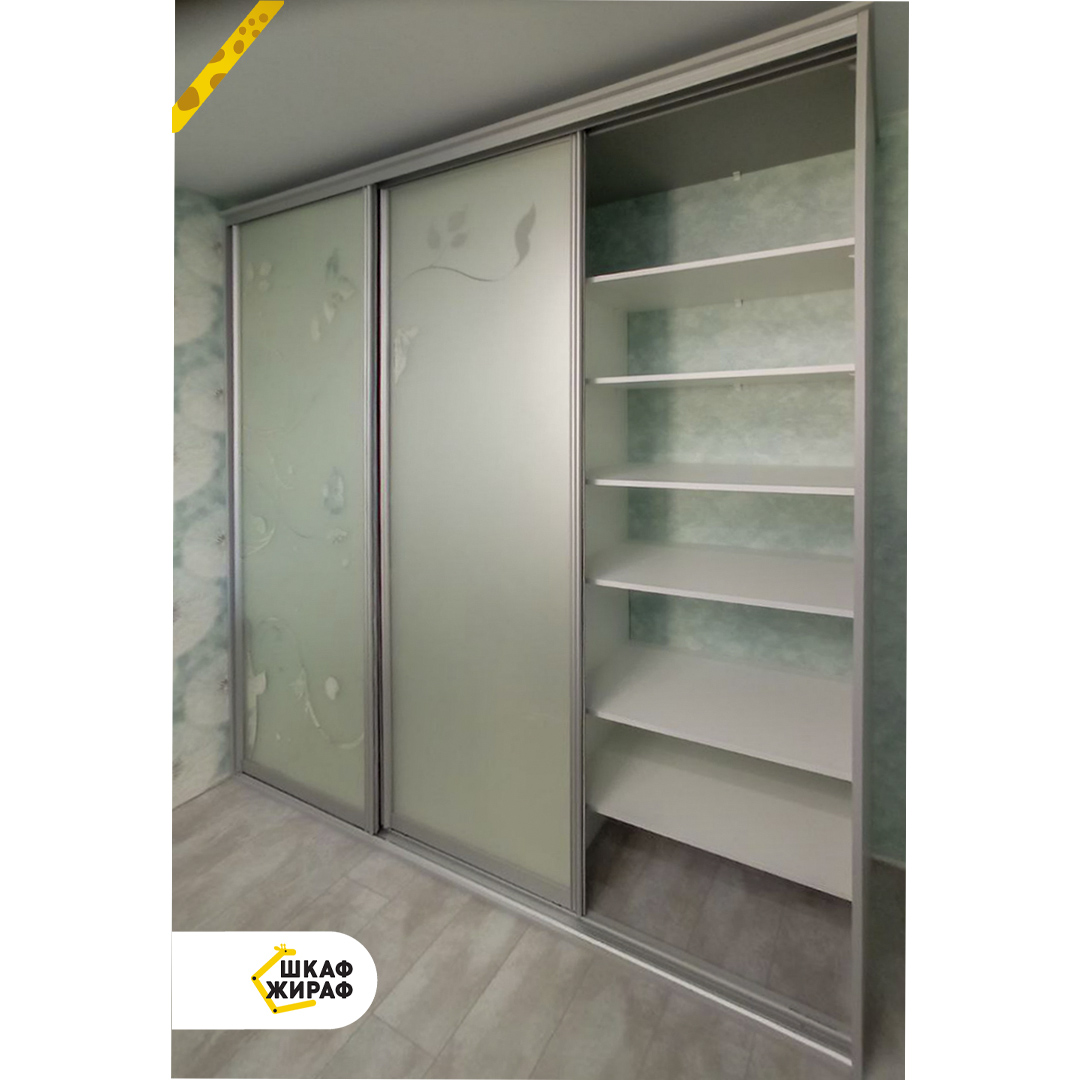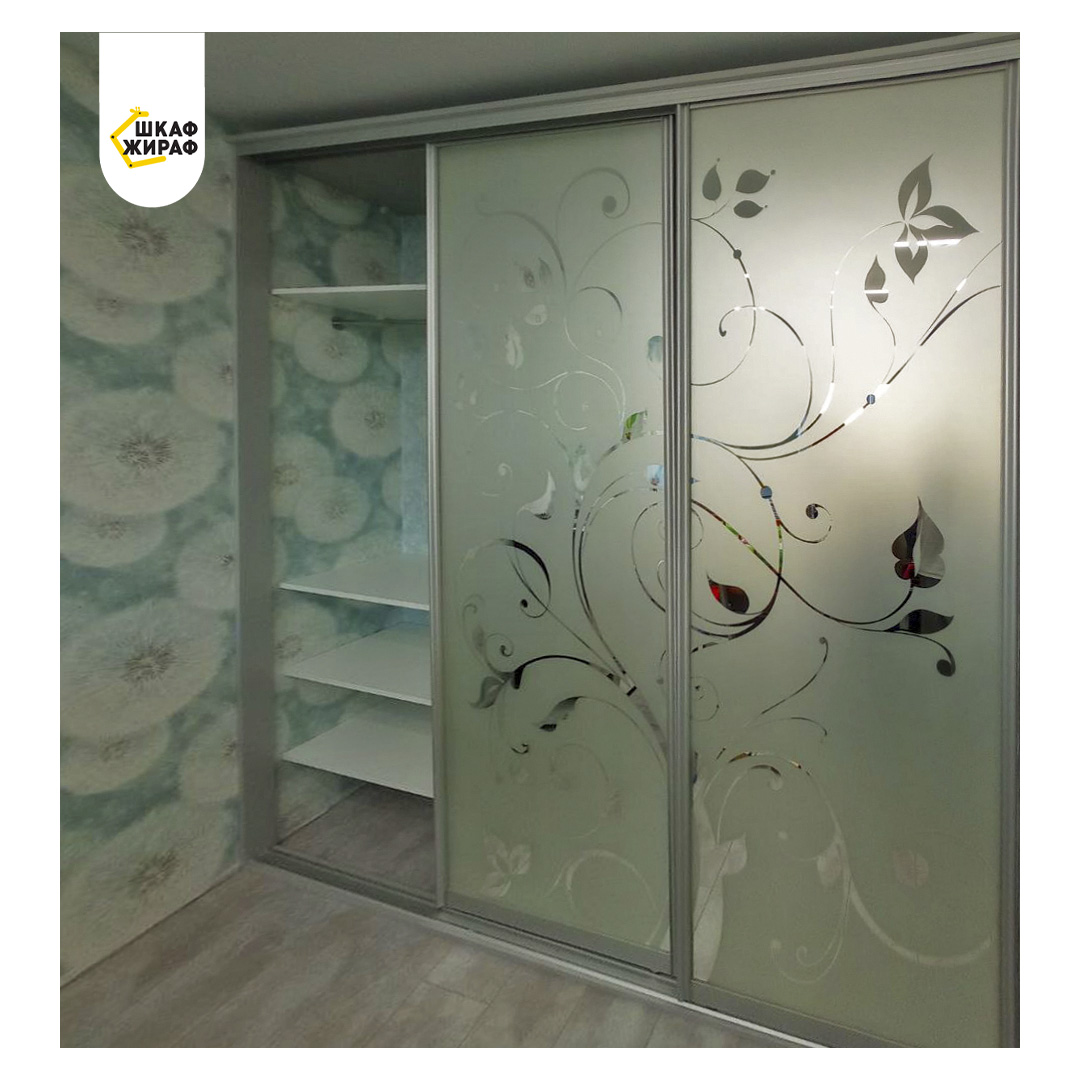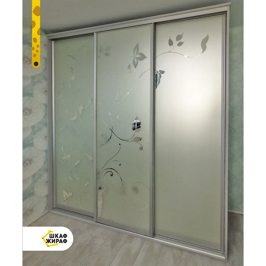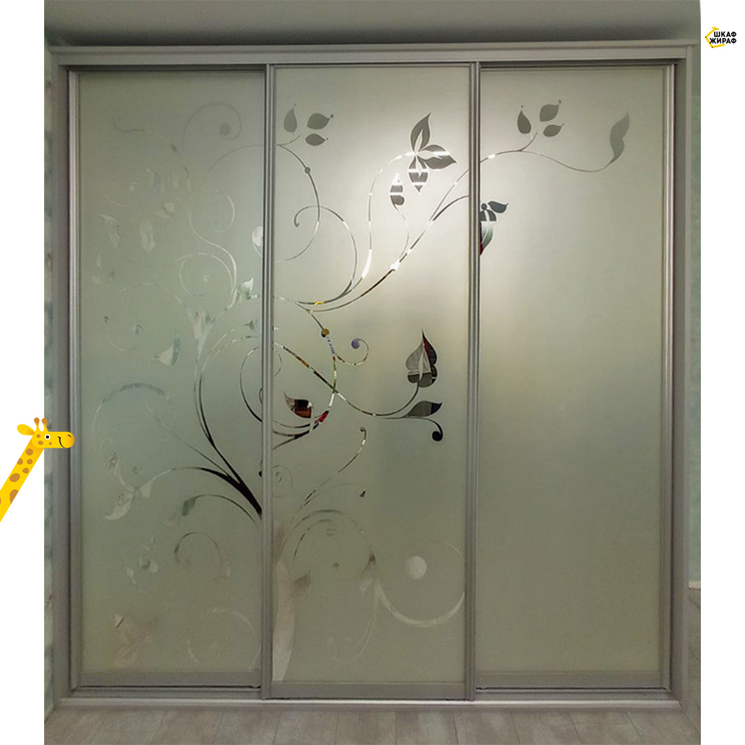Трехдверный шкаф-купе с пескоструйным рисунком на зеркале в серебряном закрытом профиле Modus.