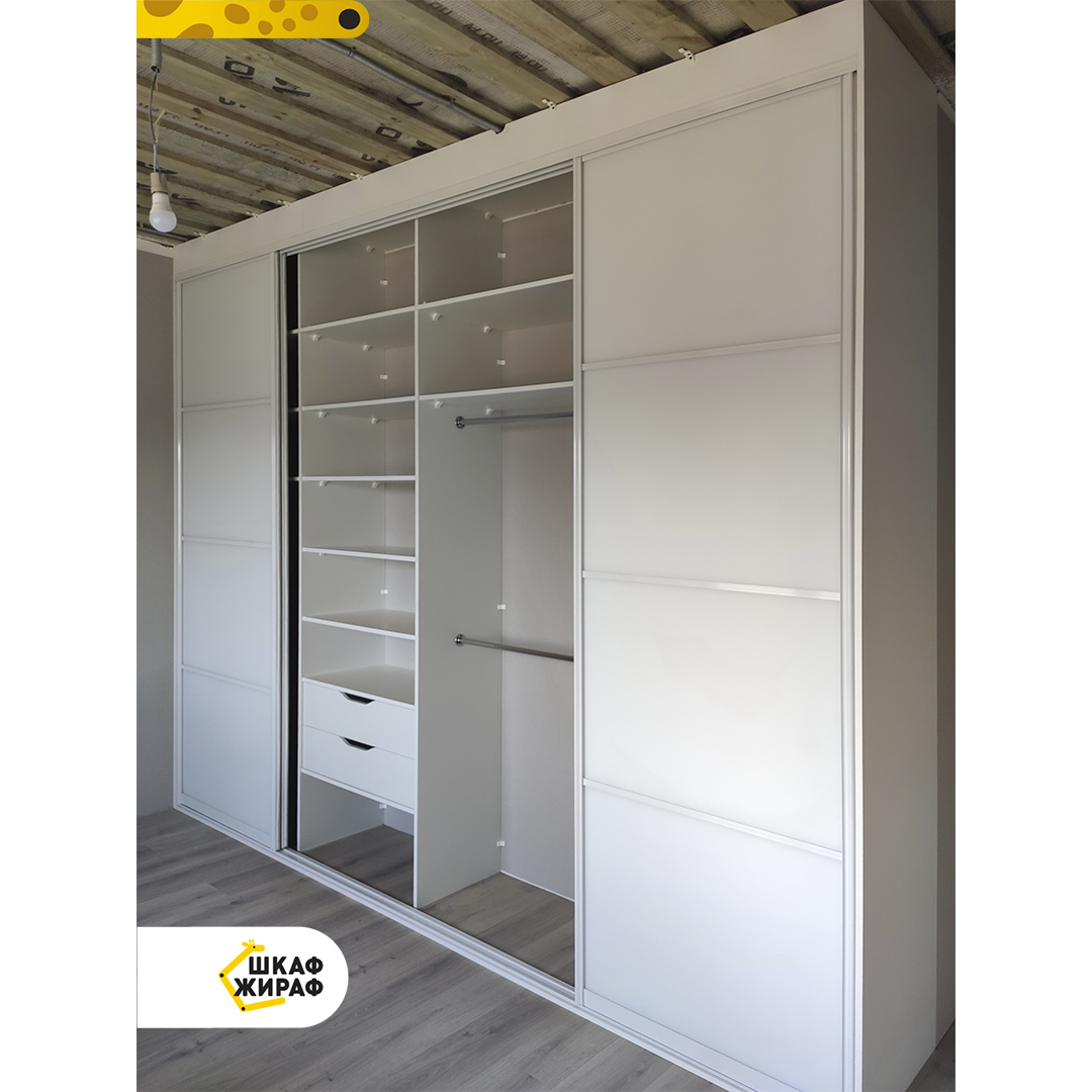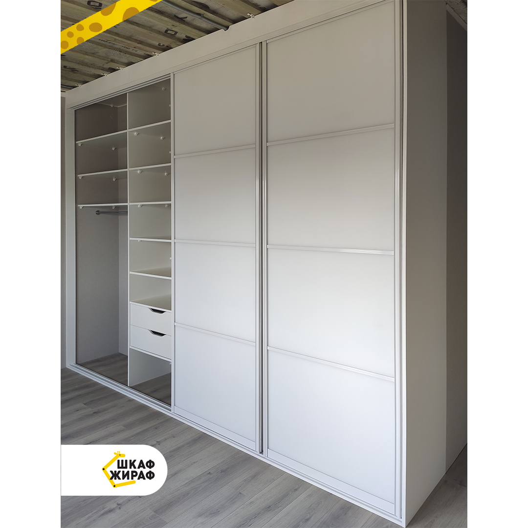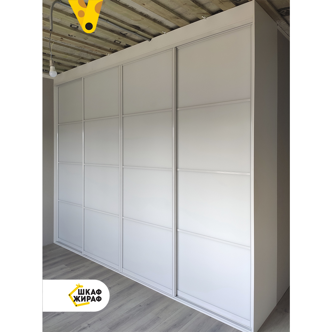 Длинный и очень высокий полувстроенный шкаф-купе с дверьми из белого мателака в белом профиле Modus.