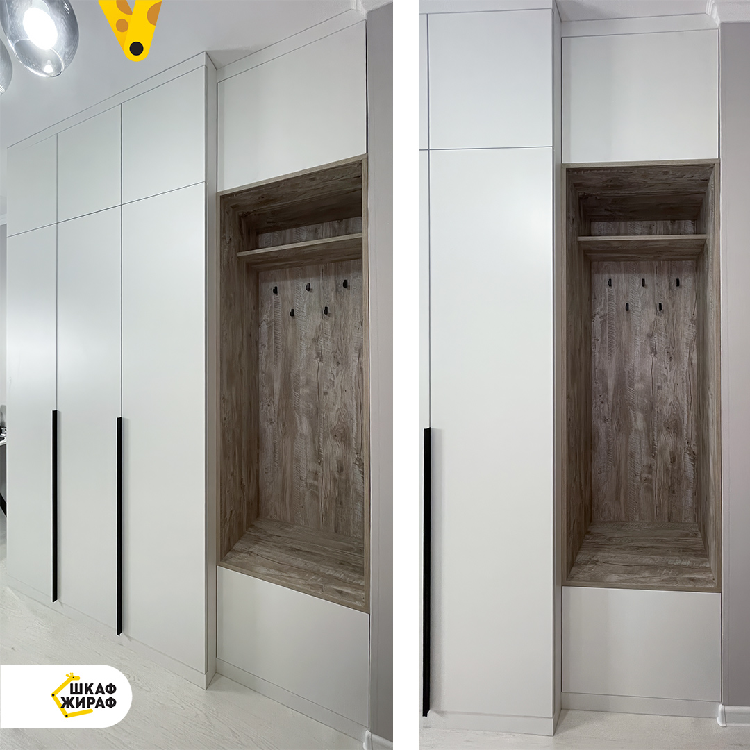 Белый распашной шкаф в комплексе прихожей из ДСП структуры дуба.