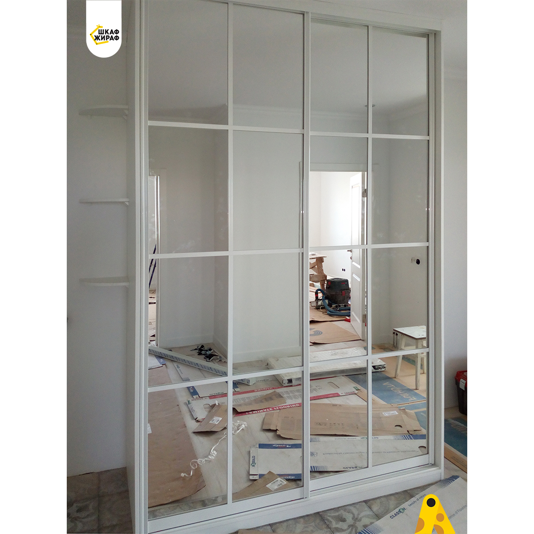 Полувстроенный шкаф-купе с двумя боковыми стенками, открытыми радиусными полками, зеркальными с разделениями раздвижными дверьми в белом профиле.