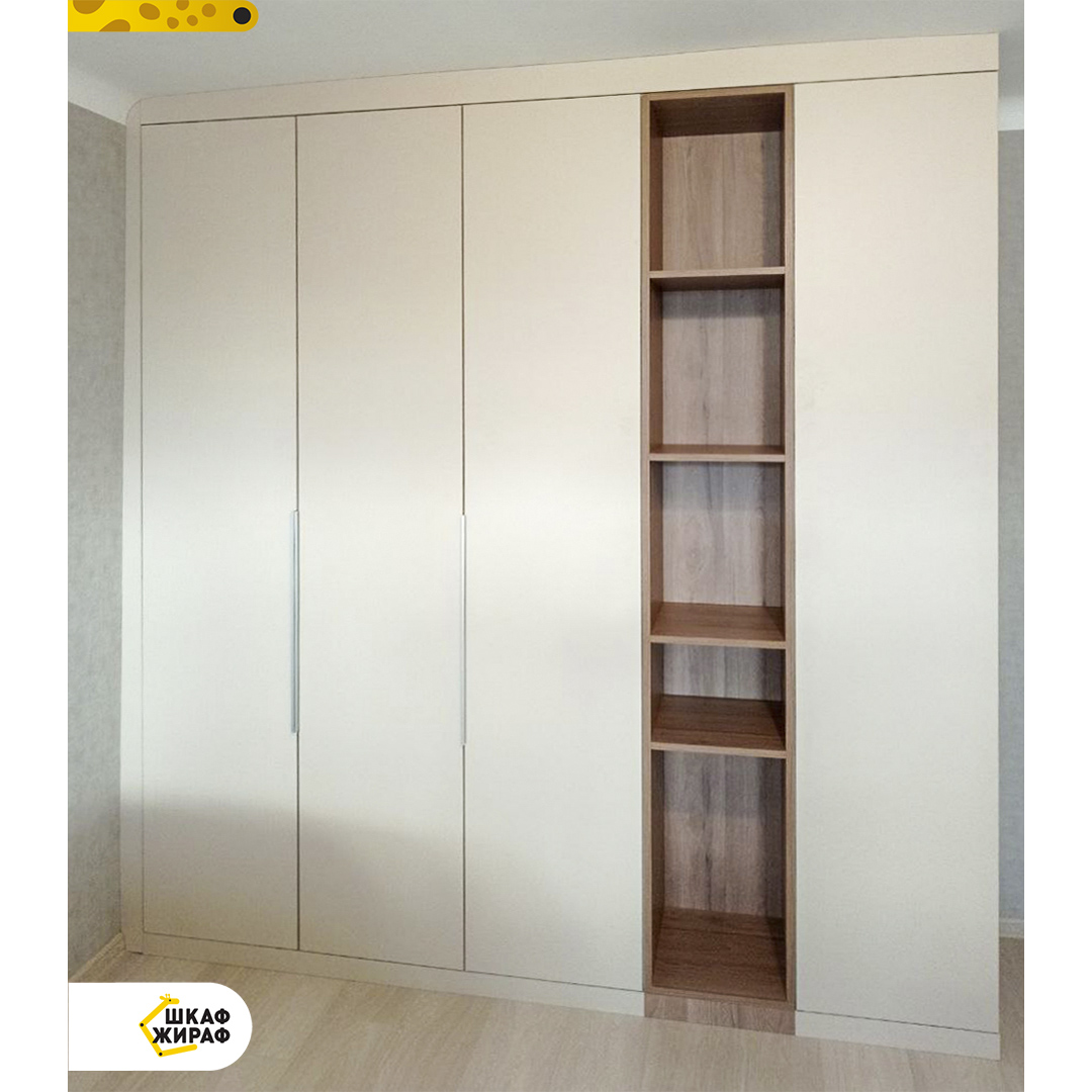 Распашной шкаф из бежевой ДСП со встроенным стеллажом открытых полок, декорированных под натуральный орех.