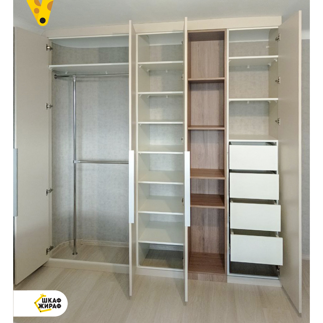 По индивидуальному проекту с полками, штангами для короткой и длинной одежды, полками и выдвижными ящиками на шариковых направляющих полного выдвижения.