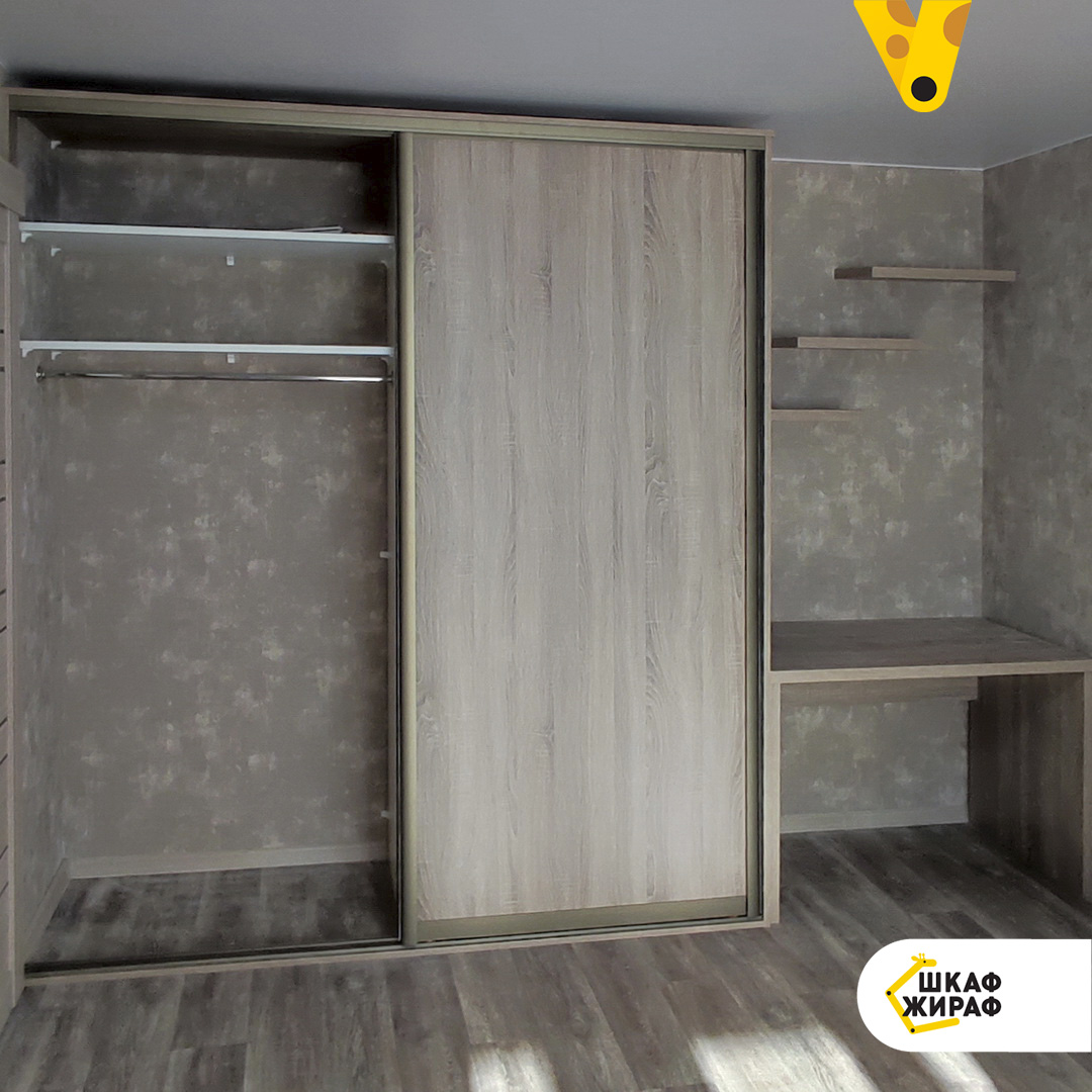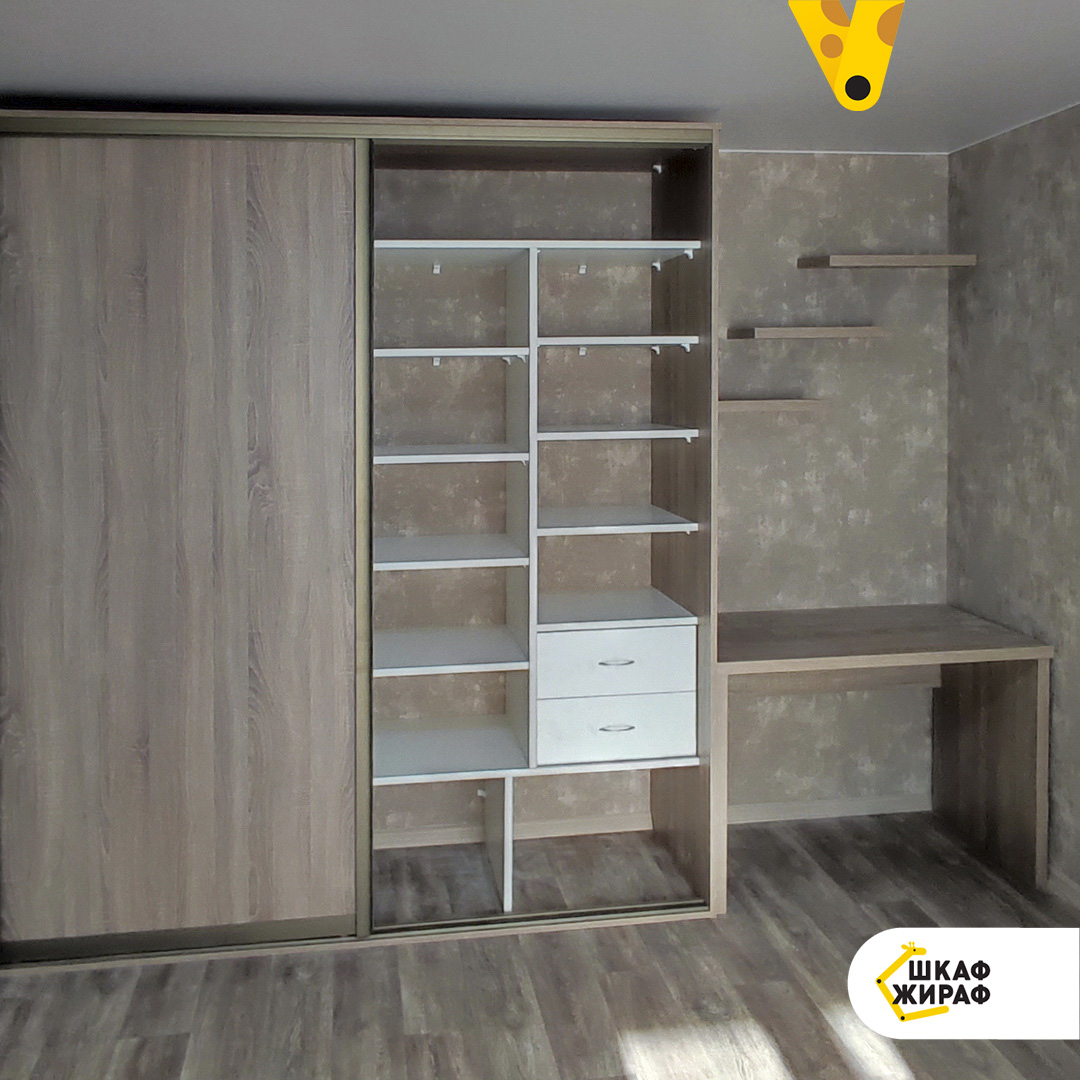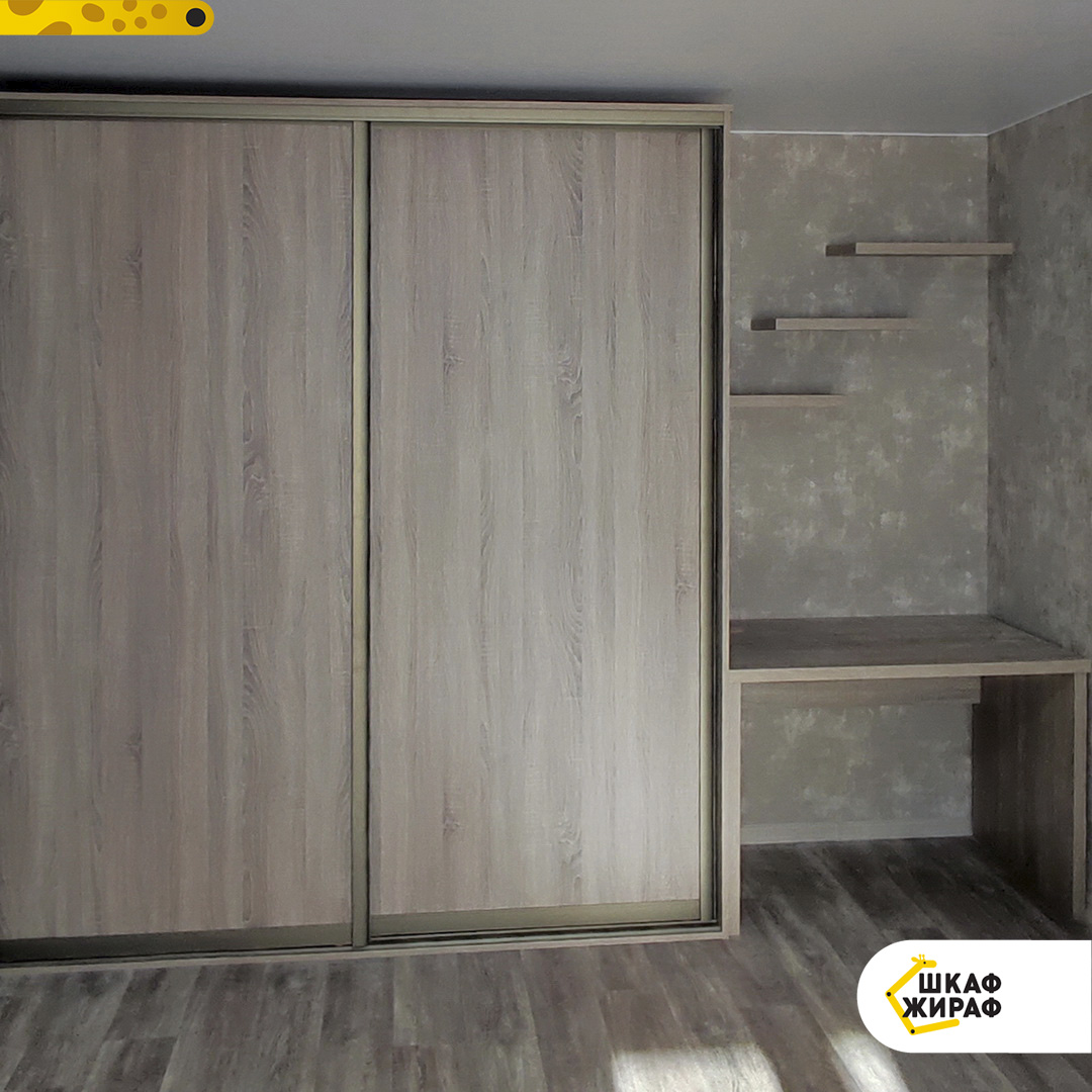 Двухдверный шкаф-купе в комплексе со столом и полками для книг.