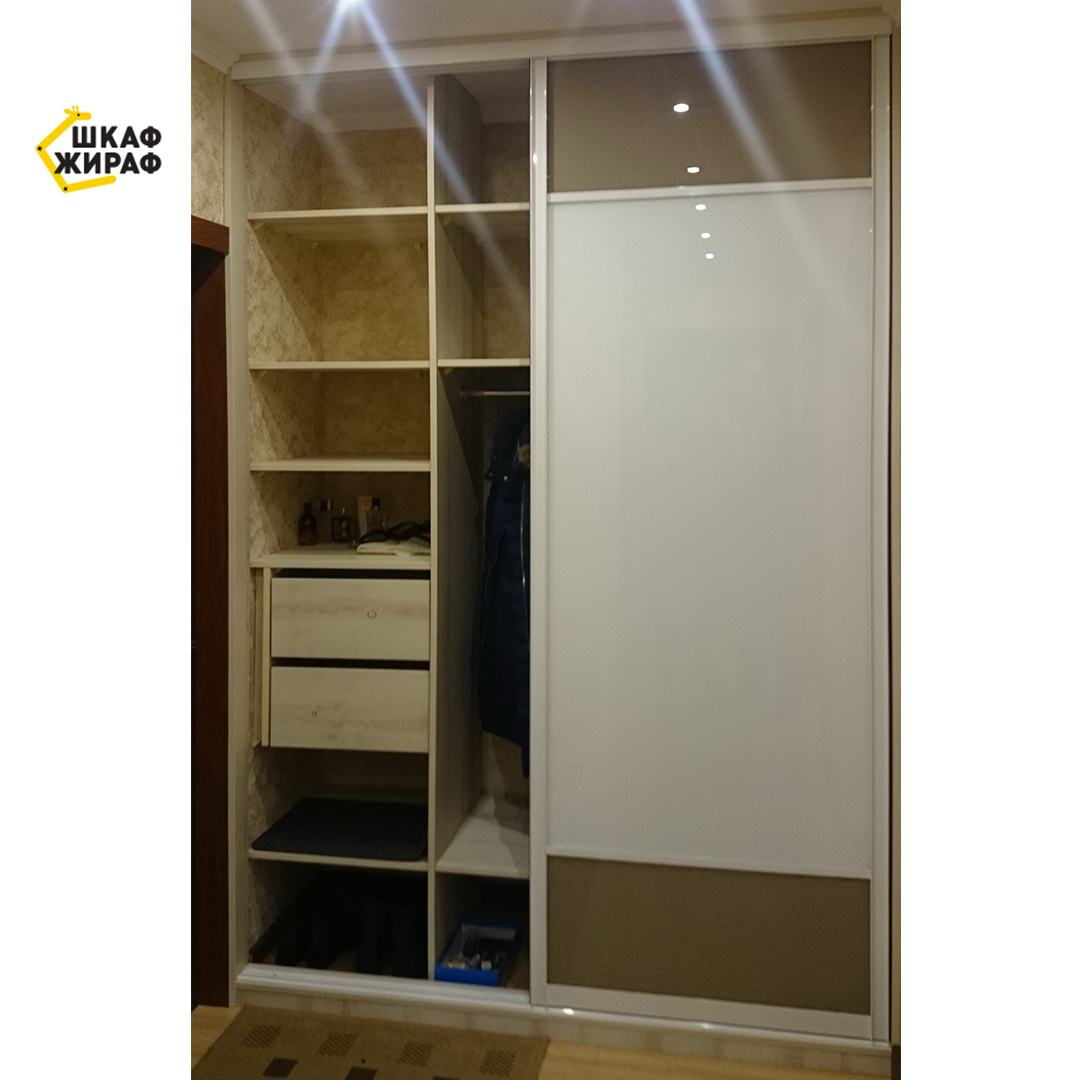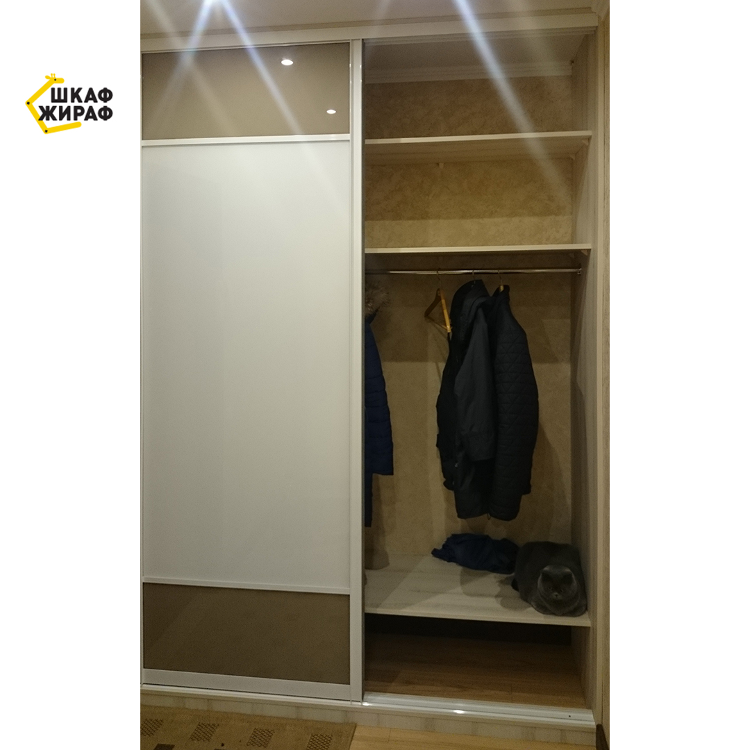Встроенный шкаф-купе в прихожей. Раздвижные двери из двух цветов лакобеля в белом широком H-образном профиле Modus.