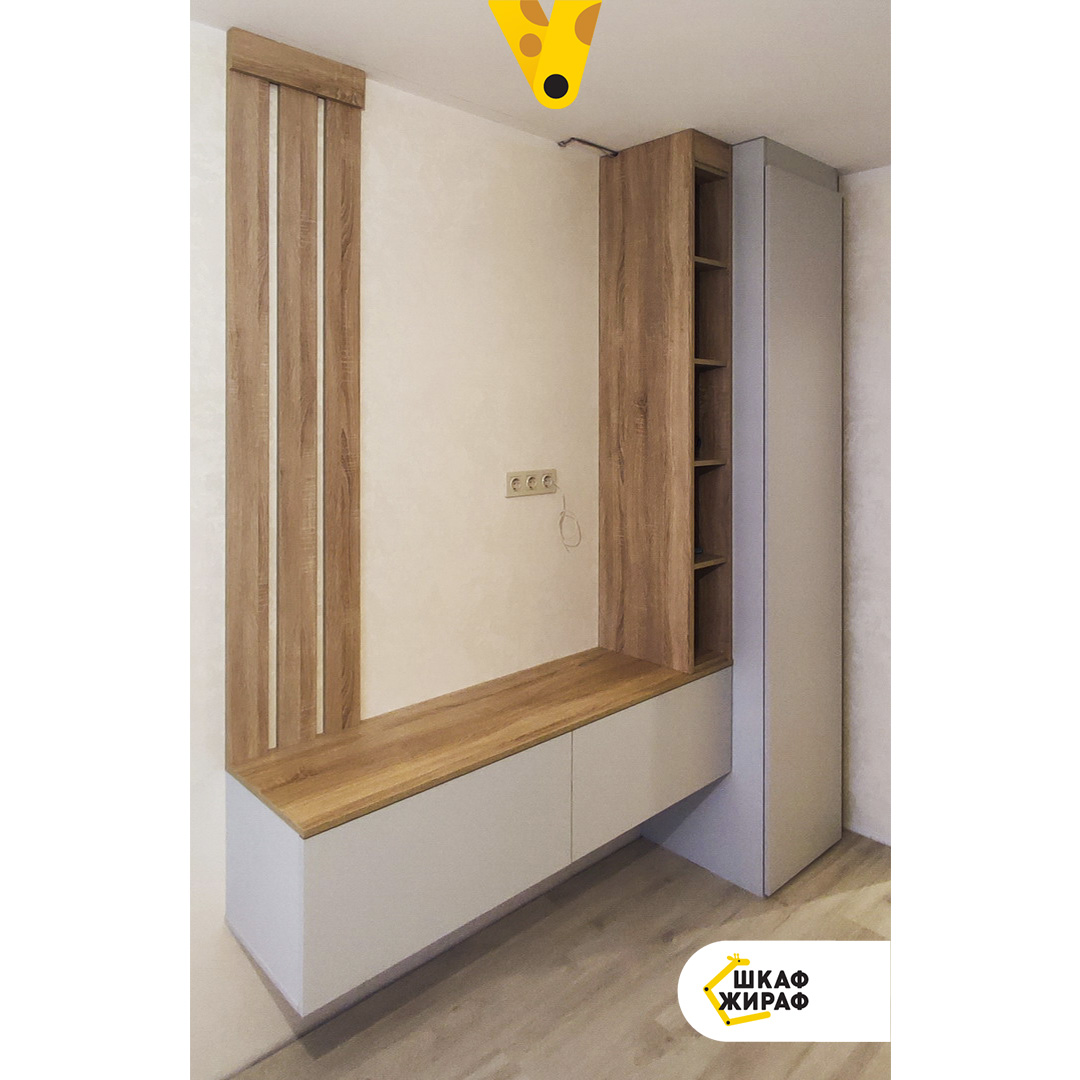 Мини-горка с подвесной тумбой под TV и распашным шкафом. Фасады без ручек открываются по нажатию с помощью системы Tip-On.