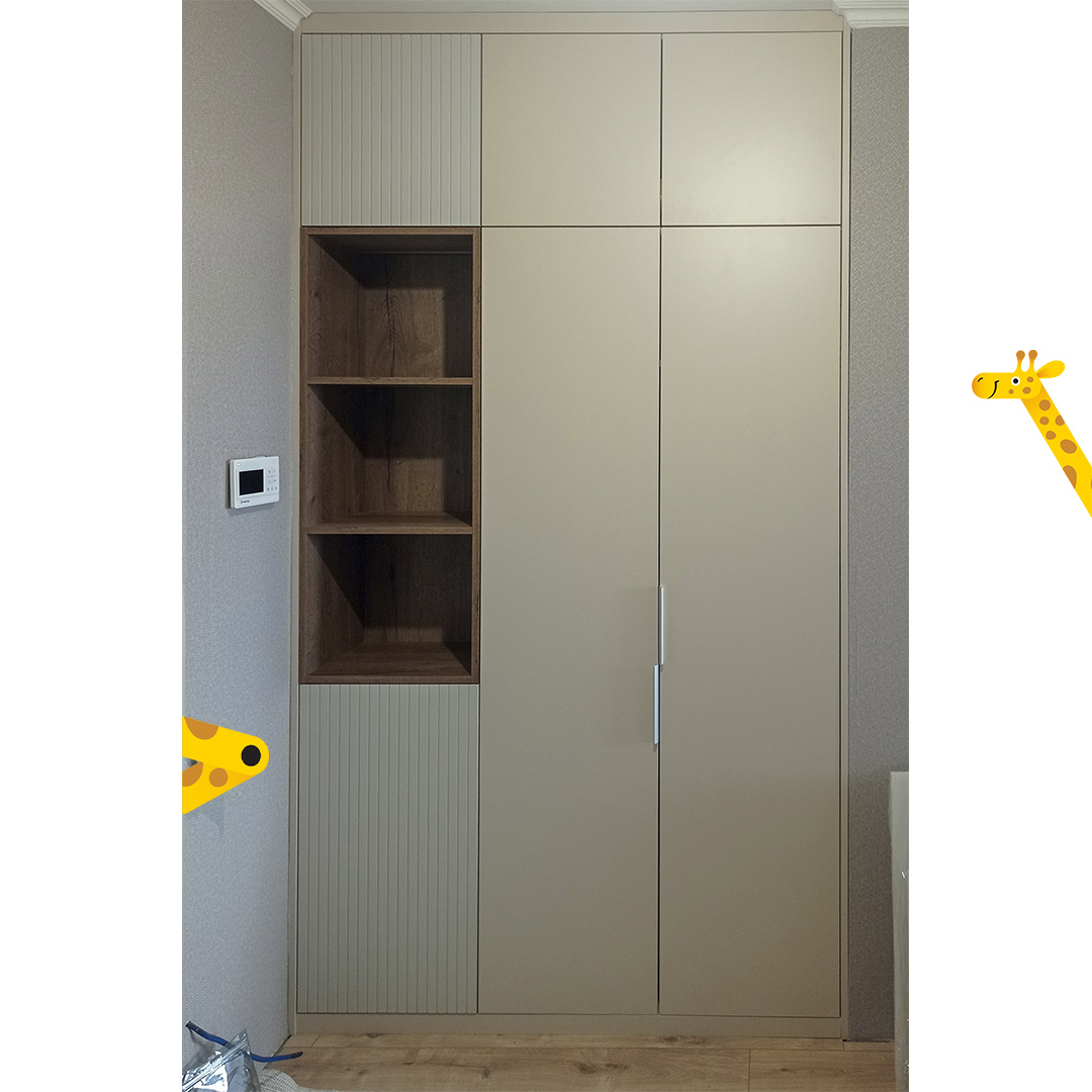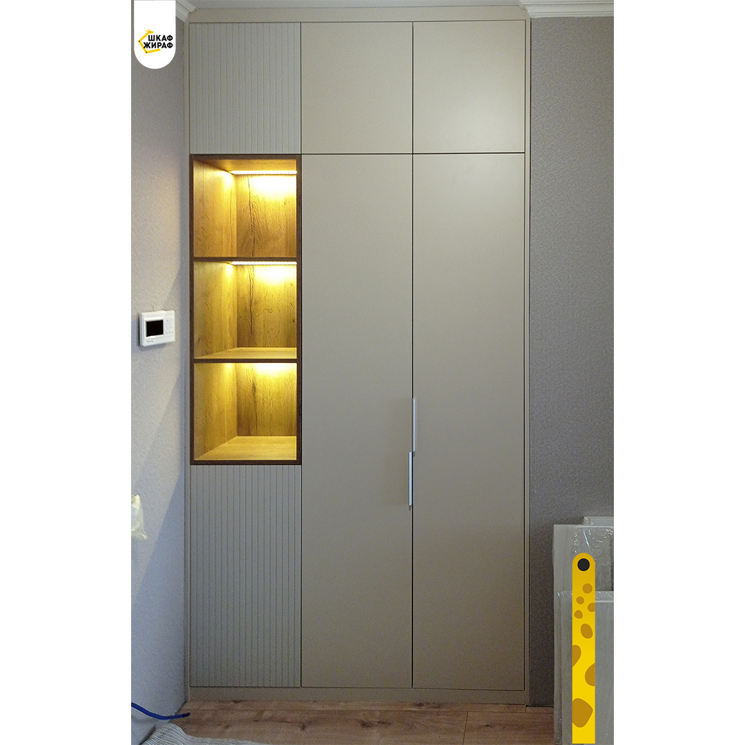 Распашной шкаф с фасадами из МДФ, отрытыми полками и подсветкой.