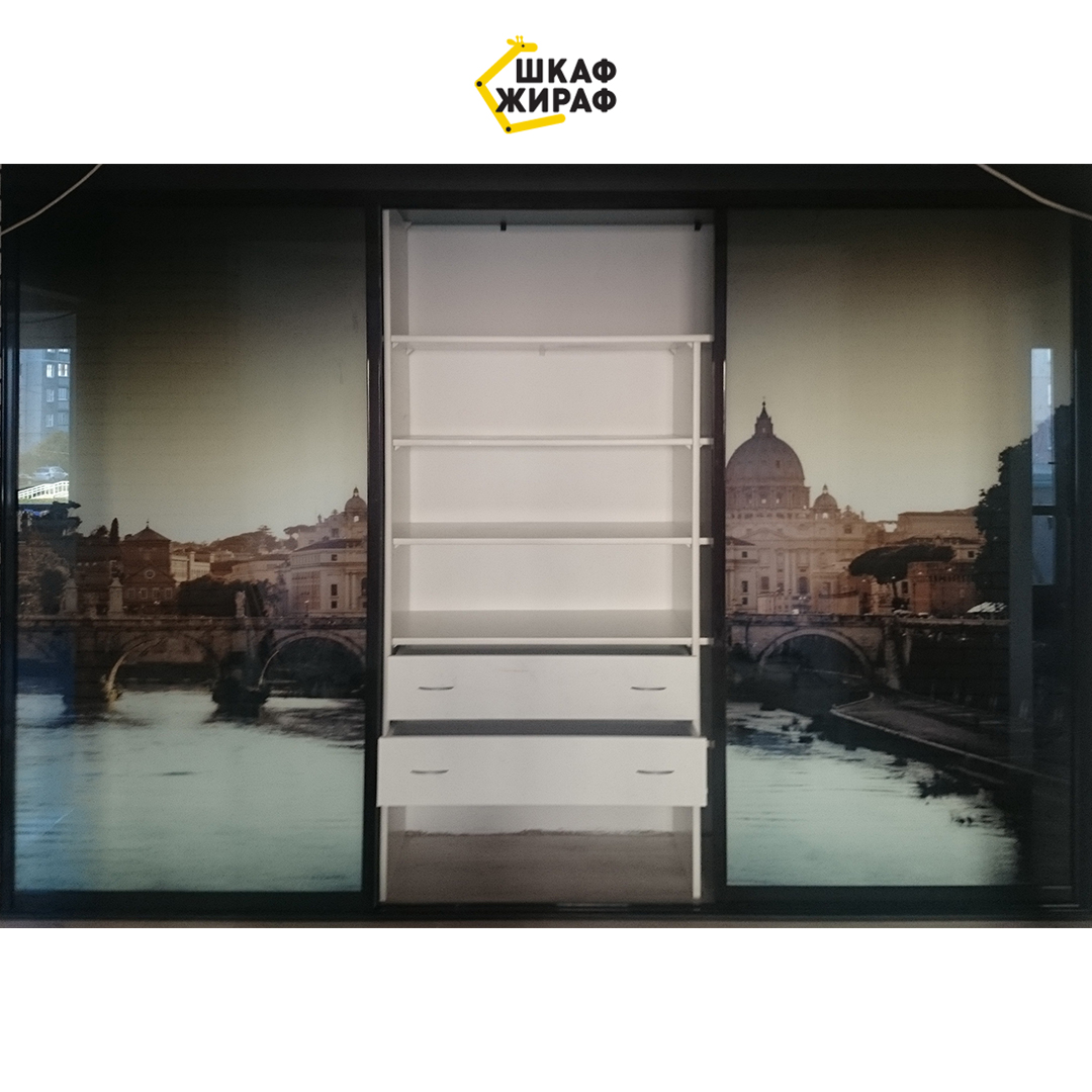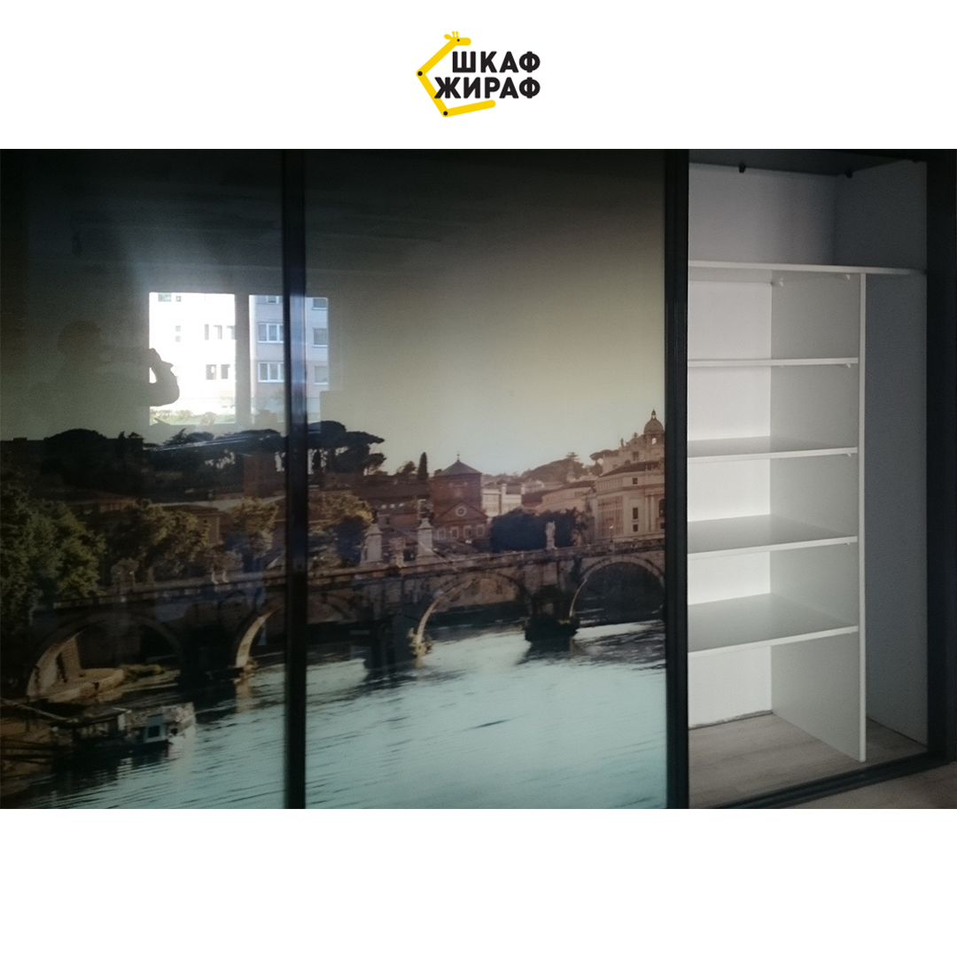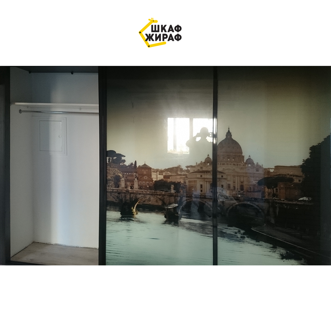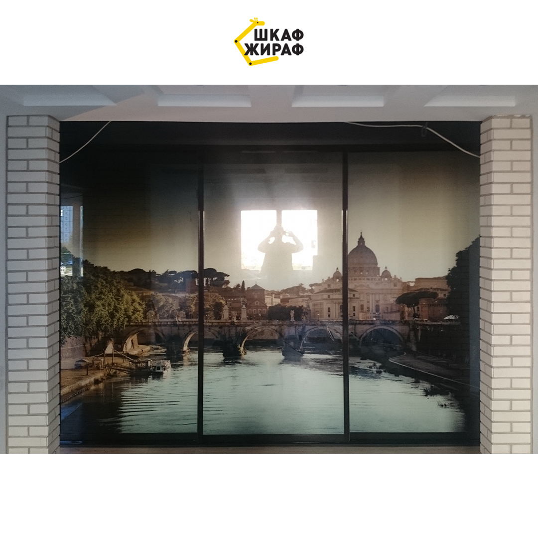 Встроенный шкаф-купе с раздвижными дверьми в H-образном темном профиле и фотопечатью в виде средиземноморского города.