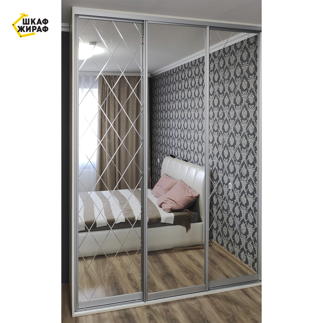 Трехдверный полувстроенный шкаф-купе с дверьми из зеркала с алмазной гравировкой в виде ромбов.