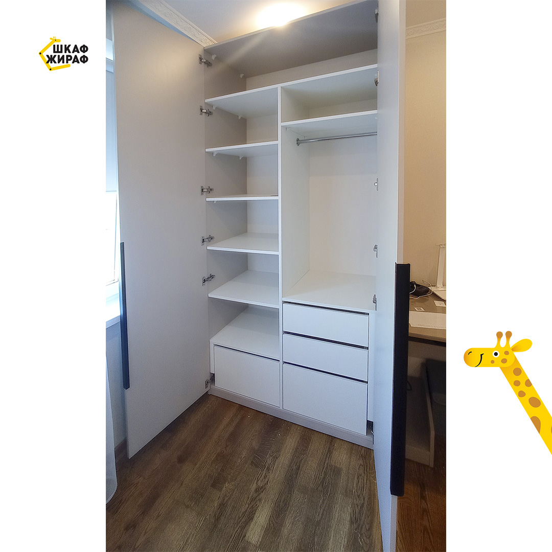 По индивидуальному проекту с полками, выдвижными ящиками, антресолью и штангой для одежды.
