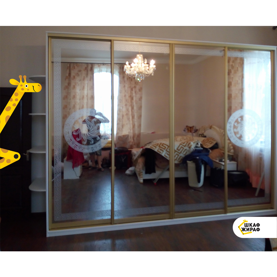 Длинный четырехдверный полувстроенный шкаф-купе с двумя боковыми стенками, зеркальными дверьми с пескоструйным рисунком на греческую античную тему.