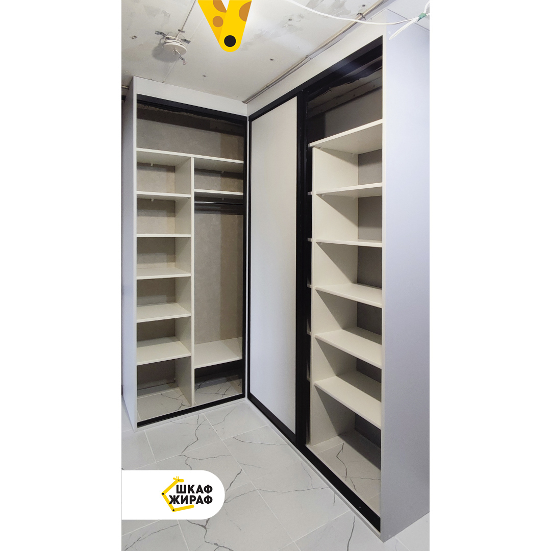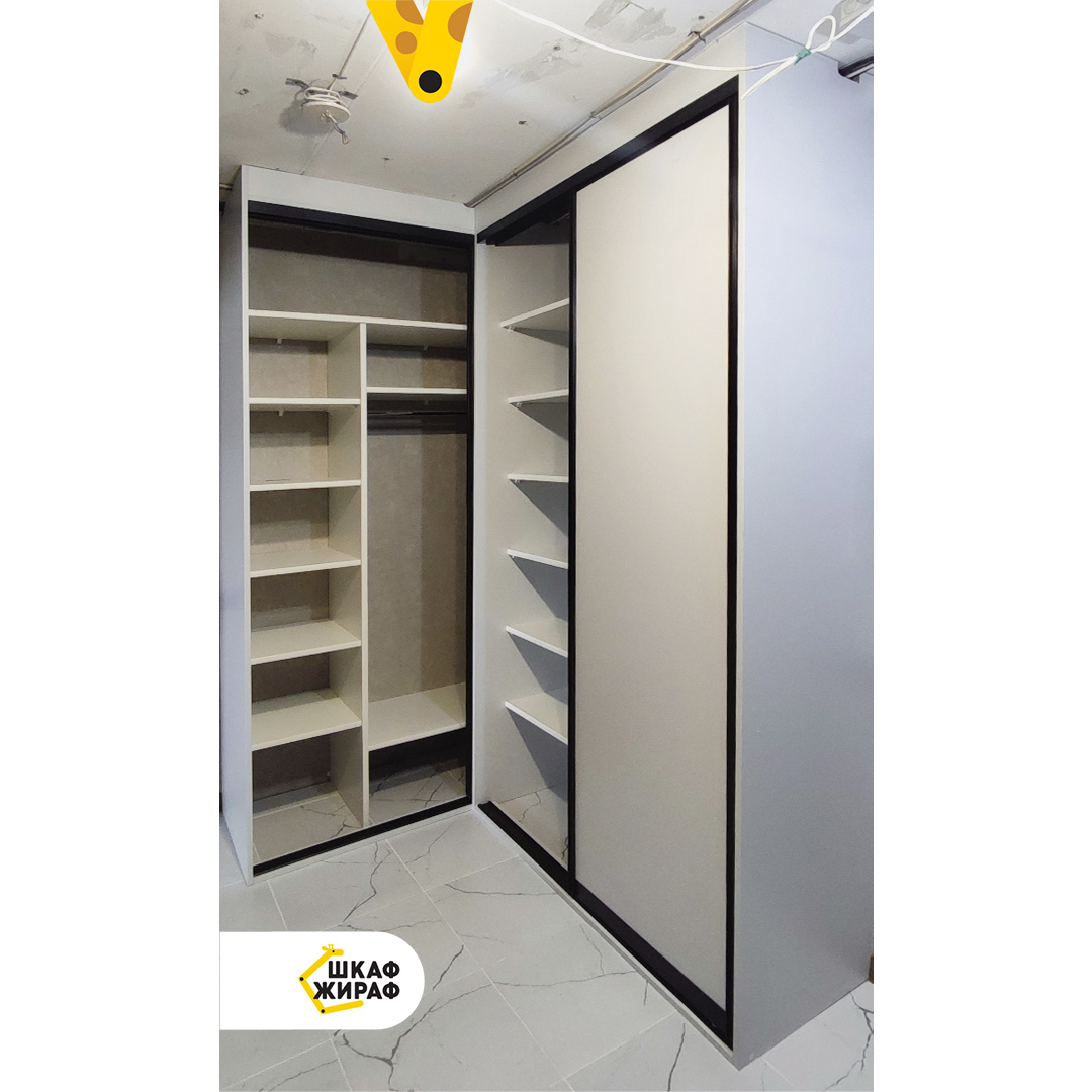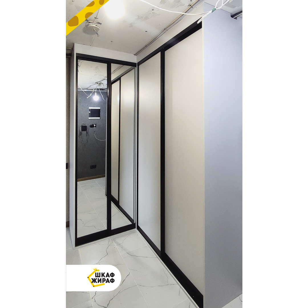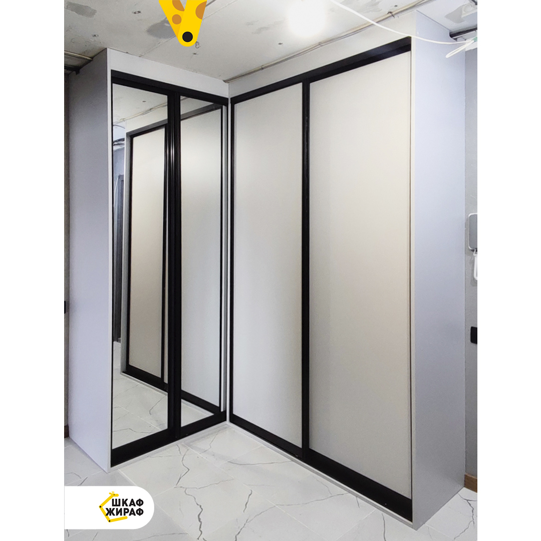 Угловой шкаф-купе с дверьми из зеркала и светло-серой ДСП в черном профиле modus.