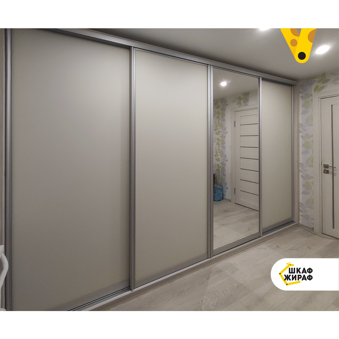 Широкий четырехдверный встроенный шкаф-купе с дверьми из белого жемчужного мателака и зеркала в серебряном профиле Modus.