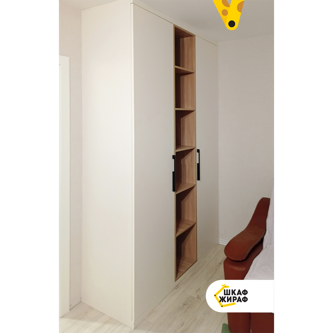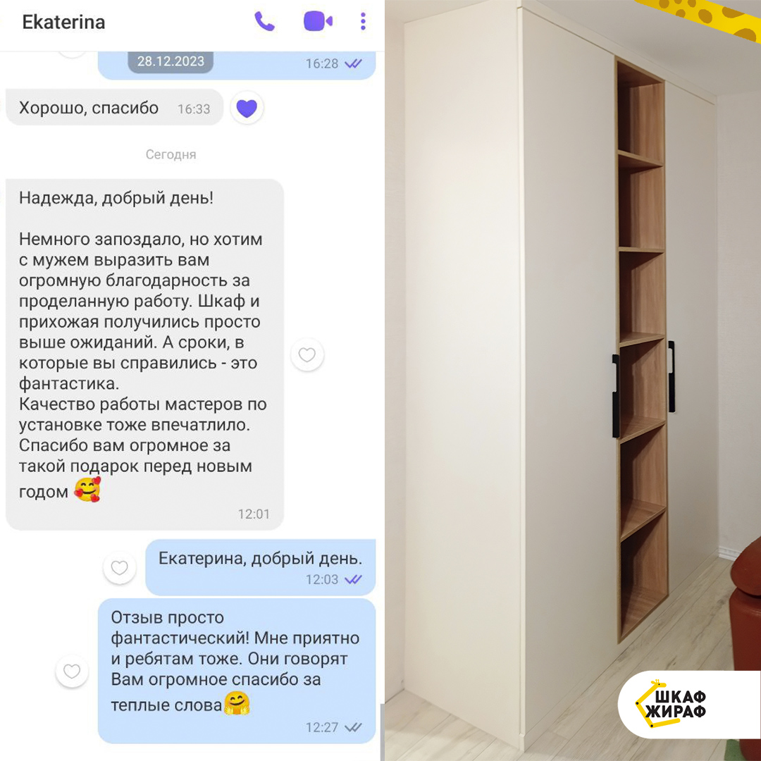 Распашной шкаф с дверьми из ДСП бежевого оттенка и открытыми полками древесной структуры дуба по центру шкафа. И классный отзыв, который прислала Екатерина нашему дизайнеру.