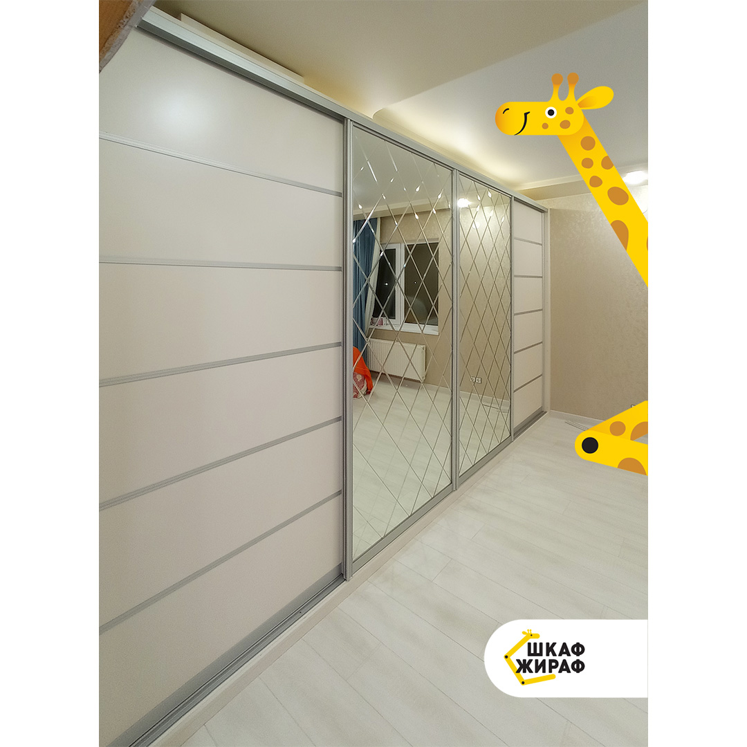 Четырехметровый встроенный шкаф-купе с дверьми из зеркала с алмазной гравировкой и ДСП миндального цвета с разделениями в серебряном профиле Modus.