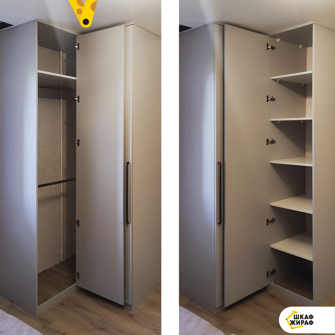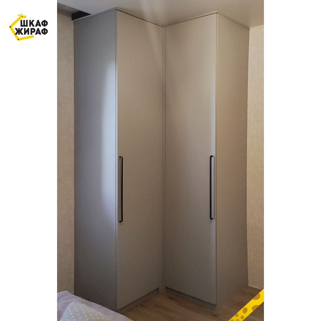 Угловой Г-образный распашной шкаф — неплохой вариант экономии площади помещения с вместительным внутренним наполнением.