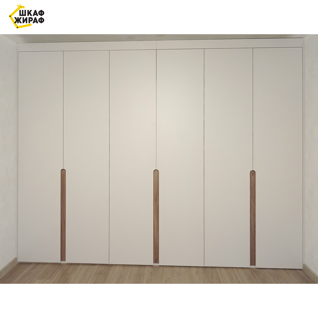 Большой распашной шкаф с фрезерованными фасадами по форме имитации ручек из ДСП древесной структуры дуба. Все фасадные петли с доводчиками австрийского бренда фурнитуры Blum.