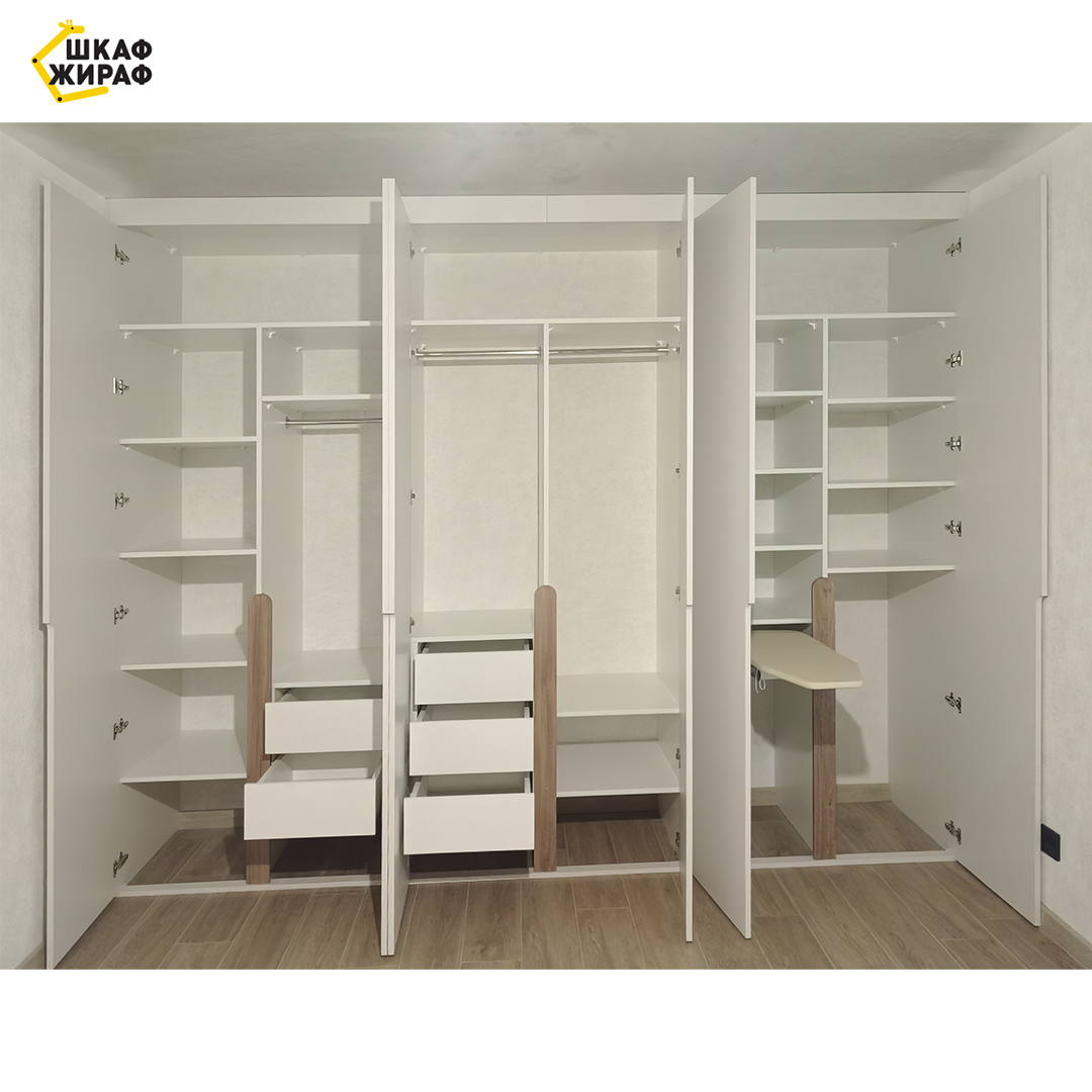 По индивидуальному проекту с множеством полок, штанг для одежды, выдвижных ящиков на шариковых направляющих полного выдвижения с доводчиками и встроенной гладильной доской.