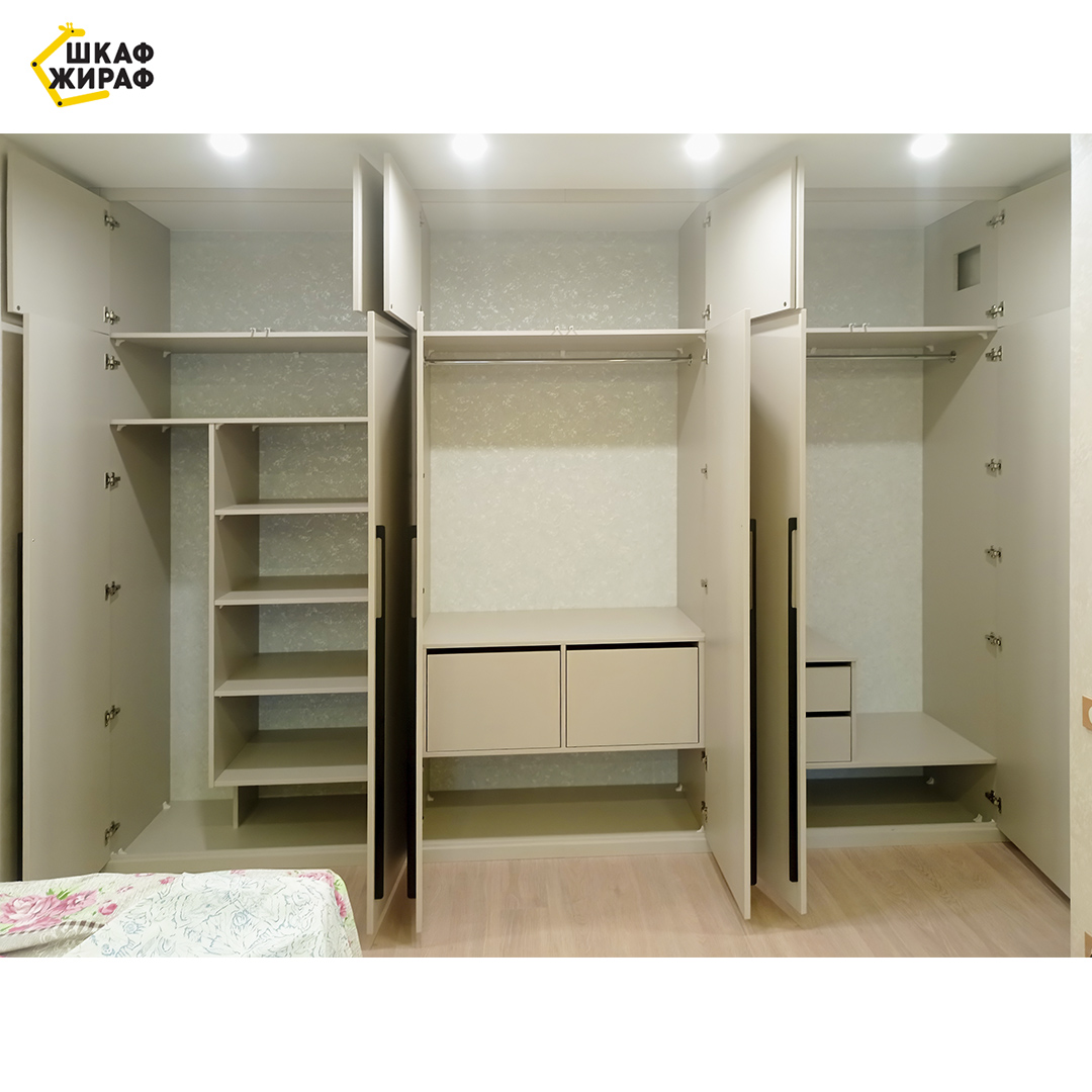 По индивидуальному проекту с полками, штангами для одежды и выдвижными ящиками на шариковых направляющих полного выдвижения.