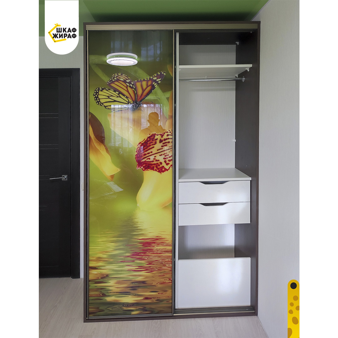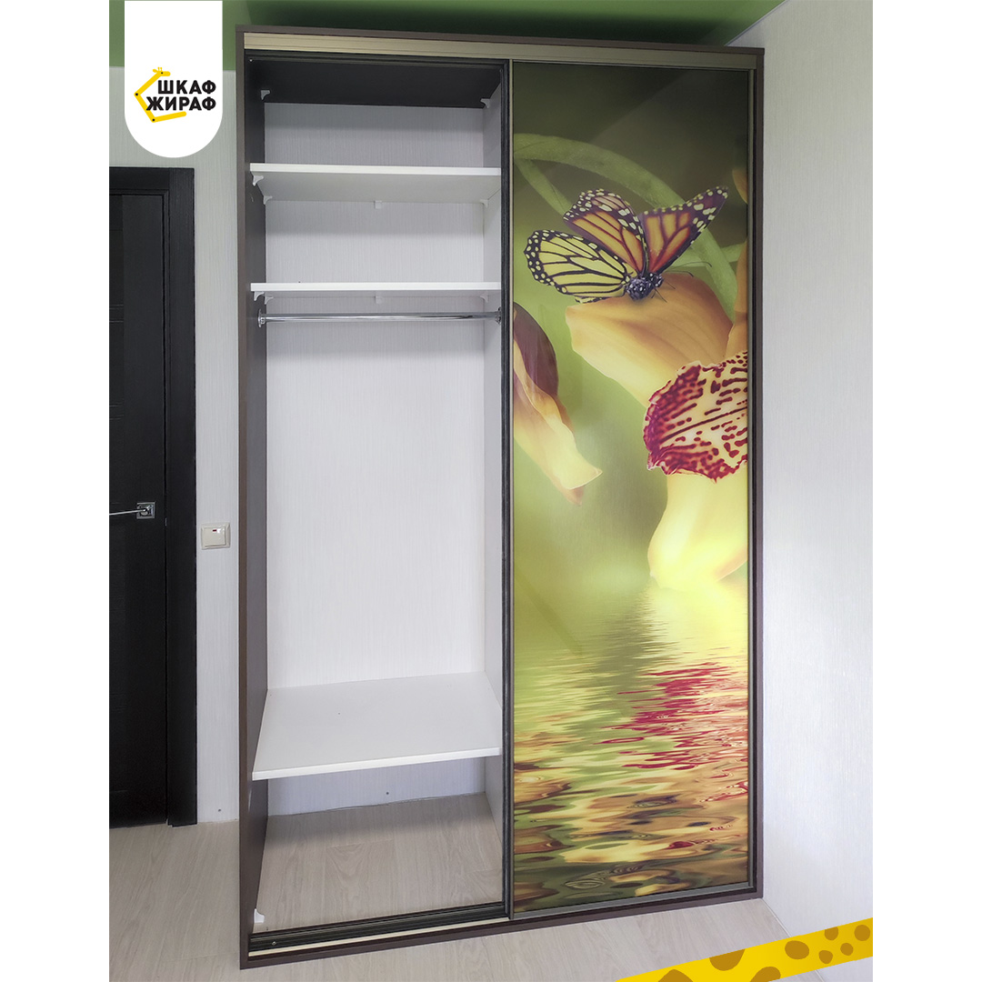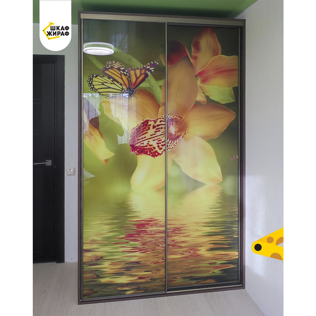 Двухдверный полувстроенный шкаф-купе с ультрафиолетовой фотопечатью на стекле в узком профиле Modus.