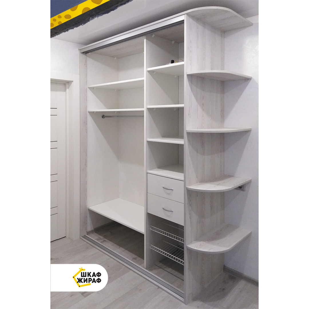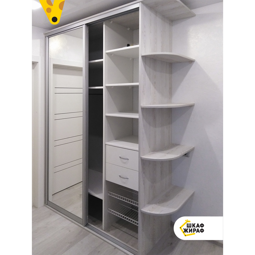 Зеркальный шкаф-купе с крышей, радиусными полками и индивидуальным наполнением с выдвижными ящиками и корзинами для обуви.