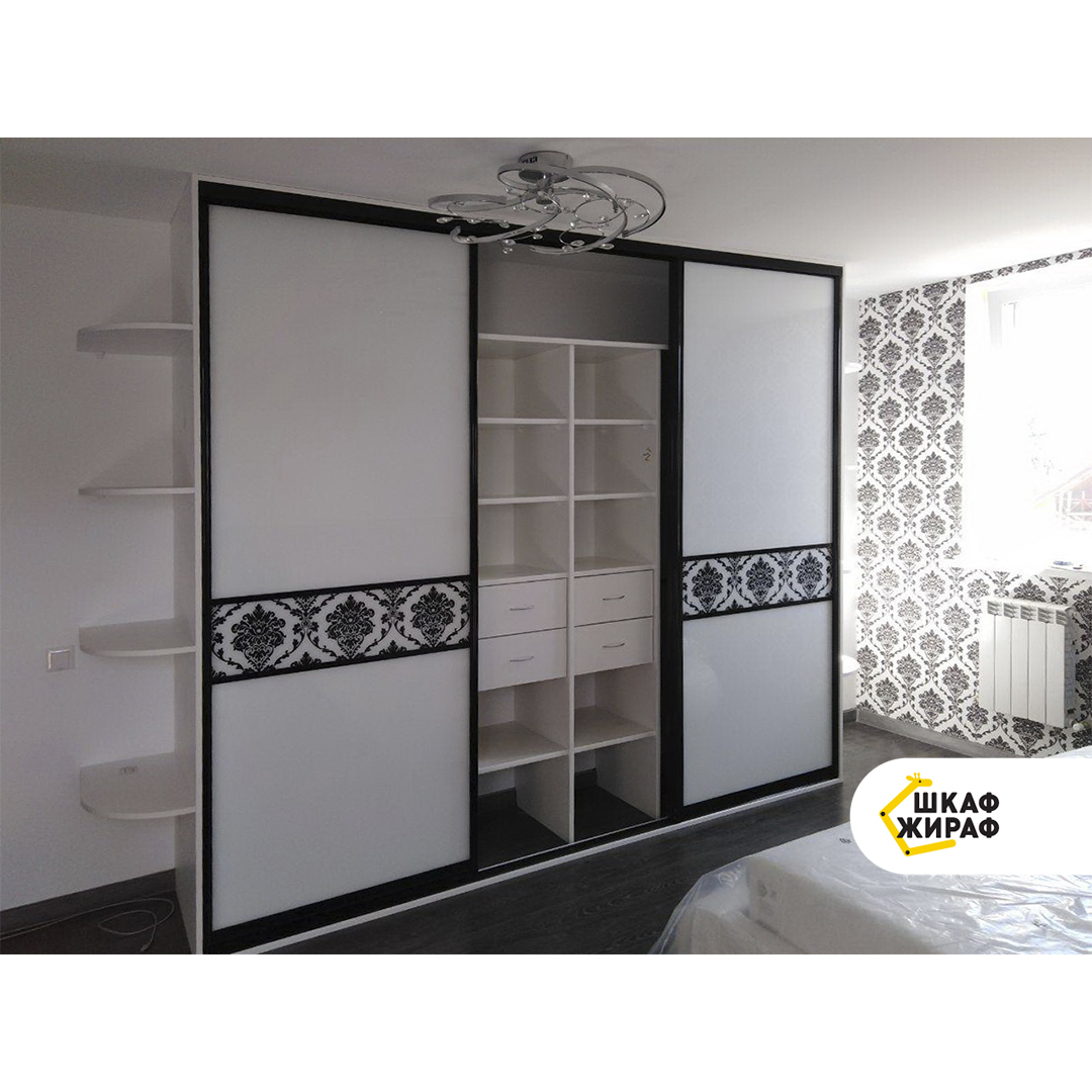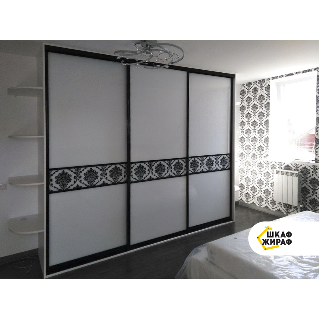 В итоге получился оригинальный фасад шкафа-купе из ультрабелого лакобеля со вставками лакобеля с черным рисунком.