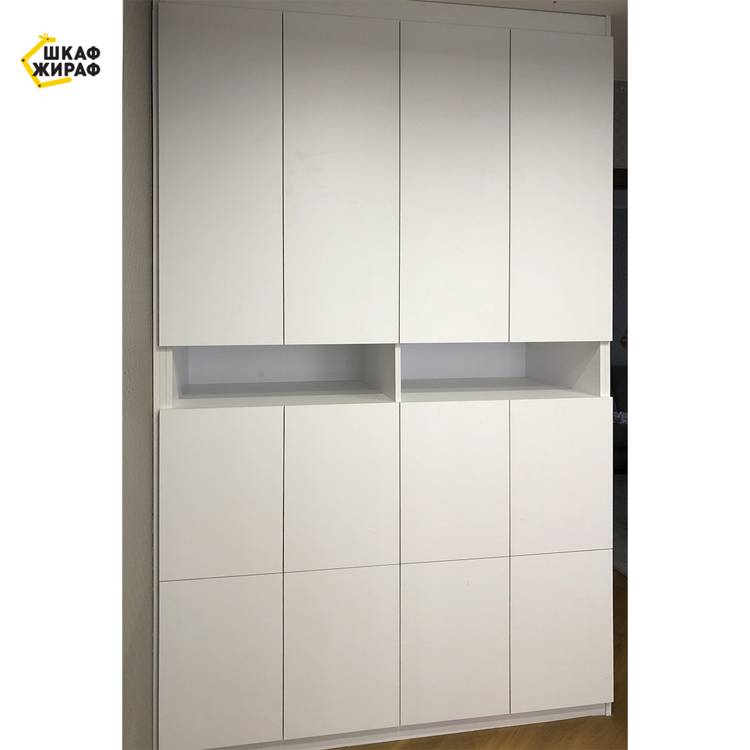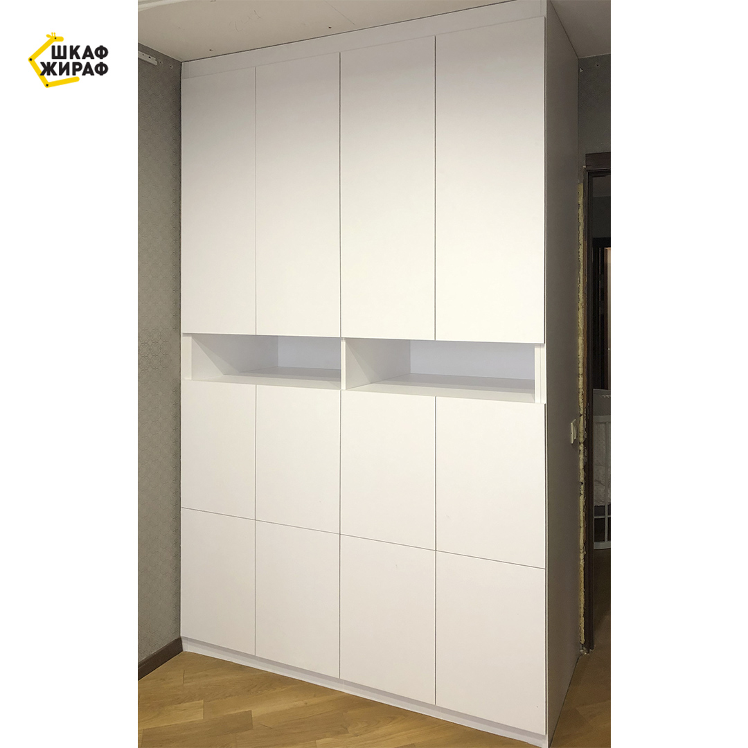 Они продумали и нарисовали эскиз, а мы по нему сделали шкаф с распашными фасадами из ДСП, которые открываются по нажатию с помощью системы Tip-on.